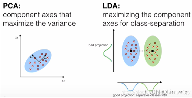 LDA:有监督降维,降维后,组内(同一类别)方差小,组间(不同类别之间)方差大