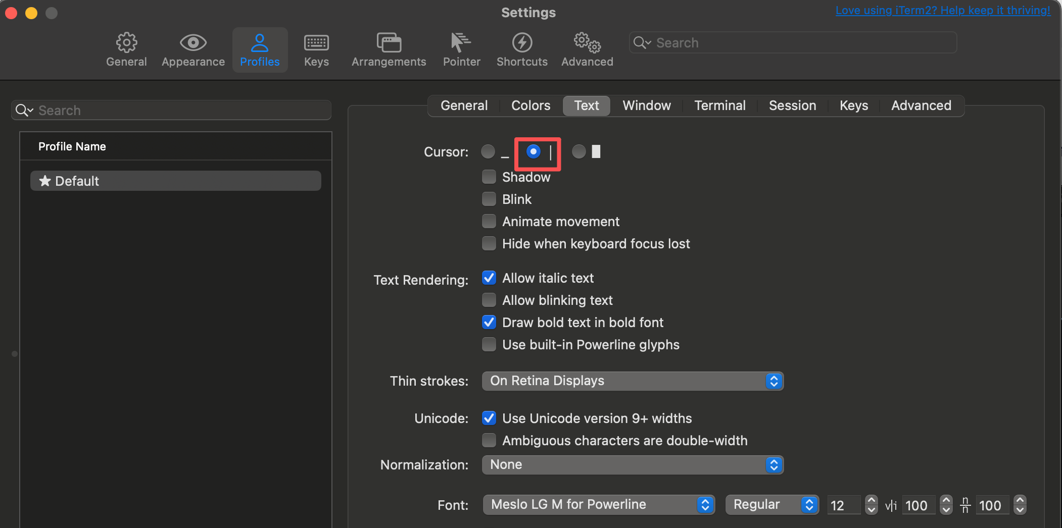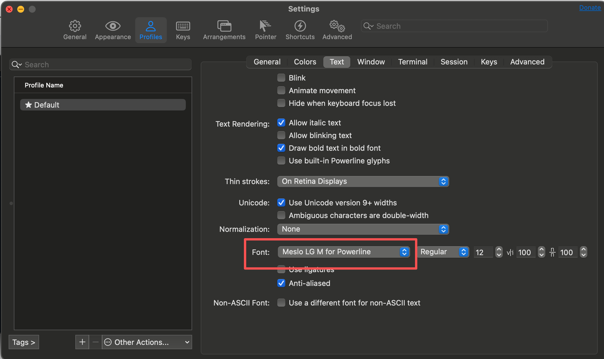 - 下载字体:https://github.com/powerline/fonts/blob/master/Meslo%20Slashed/Meslo%20LG%20M%20Regular%20for%20Powerline.ttf