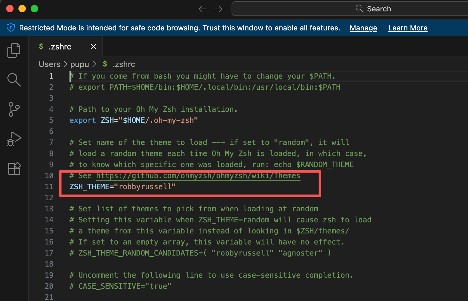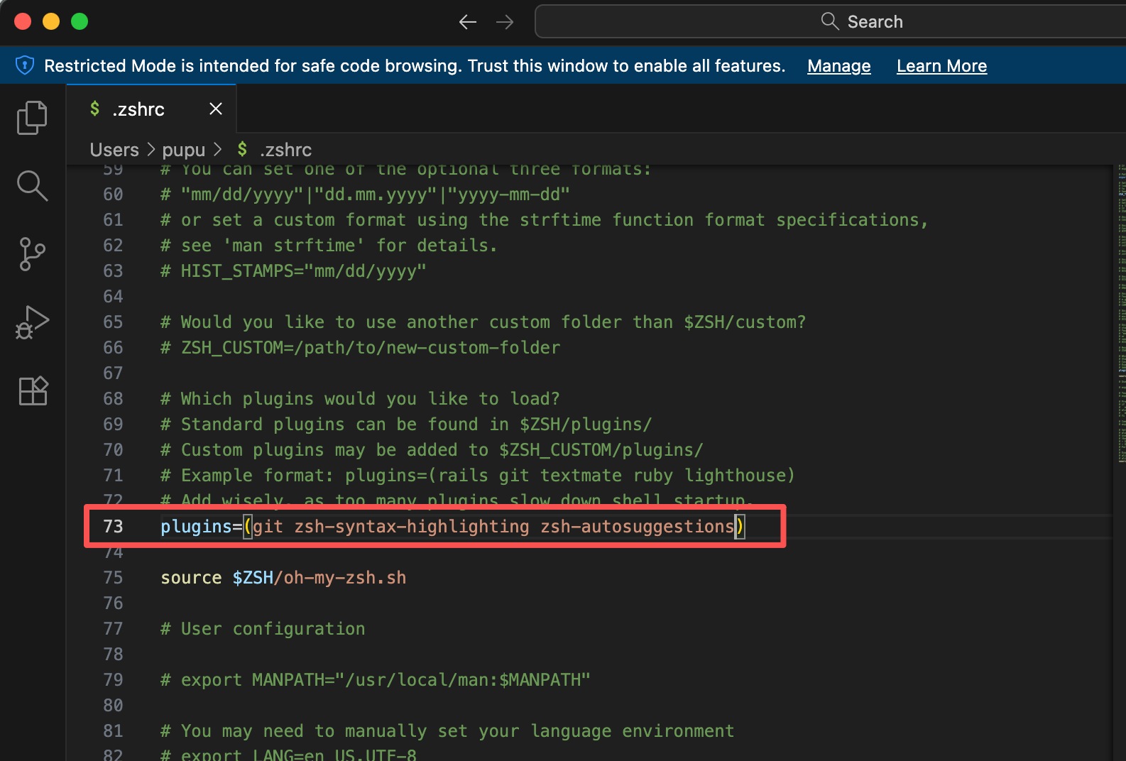 git clone git@github.com:zsh-users/zsh-syntax-highlighting.git ~/.oh-my-zsh/custom/plugins/zsh-syntax-highlighting - 在~/.zshrc 进入编辑,找到plugins 添加 zsh-syntax-highlighting