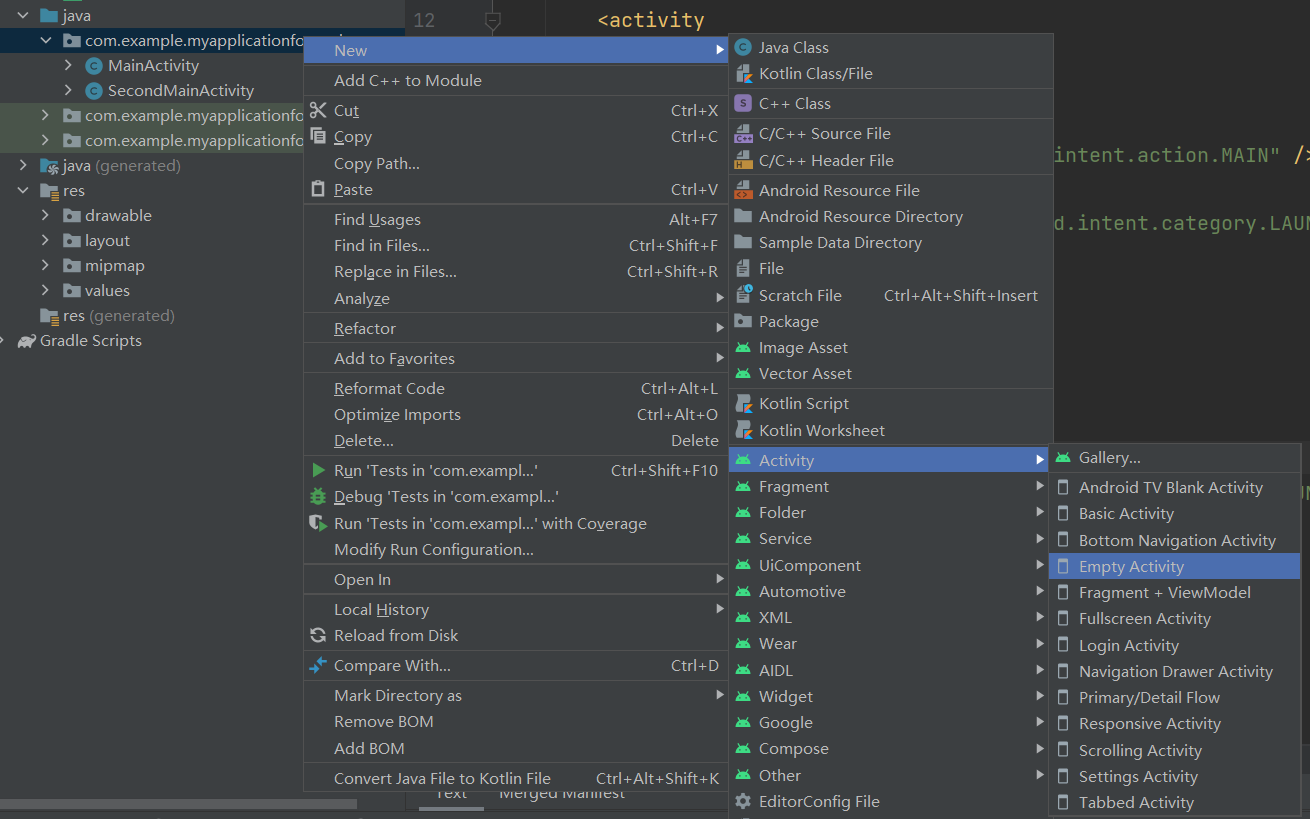 - 点击java目录下的包名后右键,在右键菜单中依次选择New→Activity→Empty Activity,如下图所示。