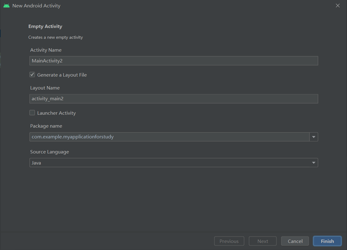 - 点击Empty Activity弹出新建页面的界面。填写页面名称,若想将该页面作为APP入口页面可以将Launcher Activity勾选,语言选择java。填完后点击Finish即可新建页面。