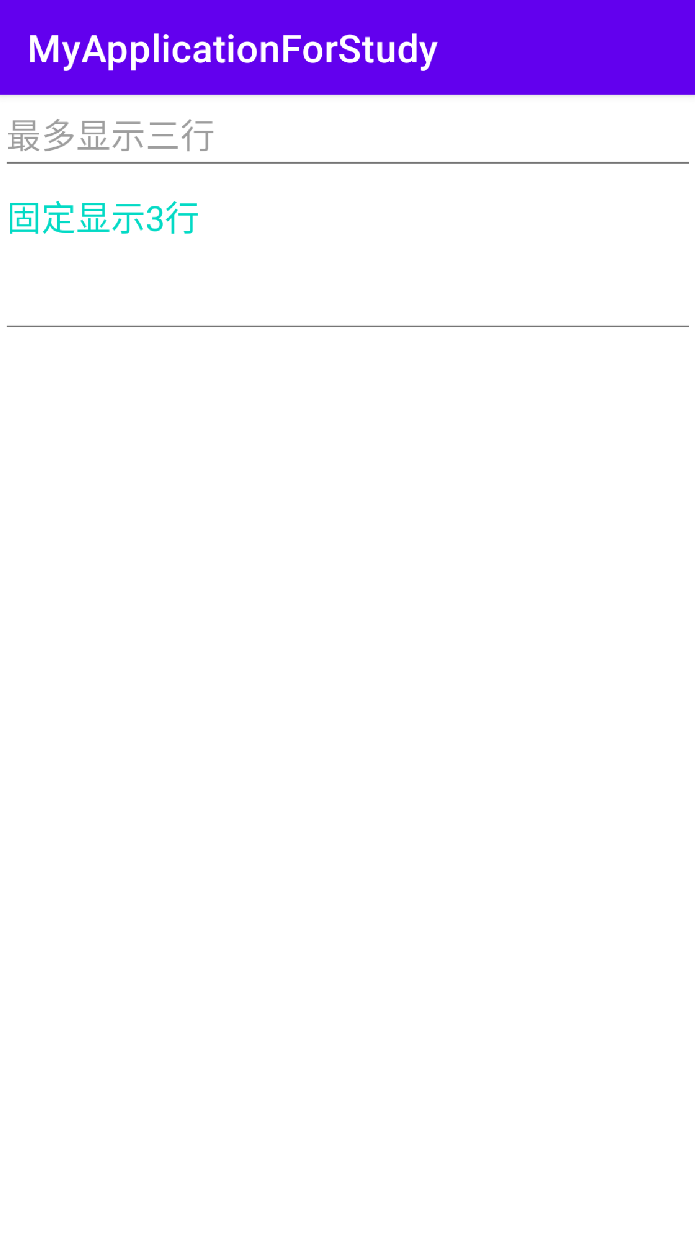 效果图如下,第一张图为输入前,第二张为输入后。第一个编辑框最多显示三行,小于三行时编辑框的高度会随行数变化但最高只有三行的高度,多出的部分可以上下滑动查看。第二个编辑框高度已经固定位三行的高度,不满三行的地方是空白的,超出三行也可以上下滑动查看。这是属性maxLines与lines的区别。