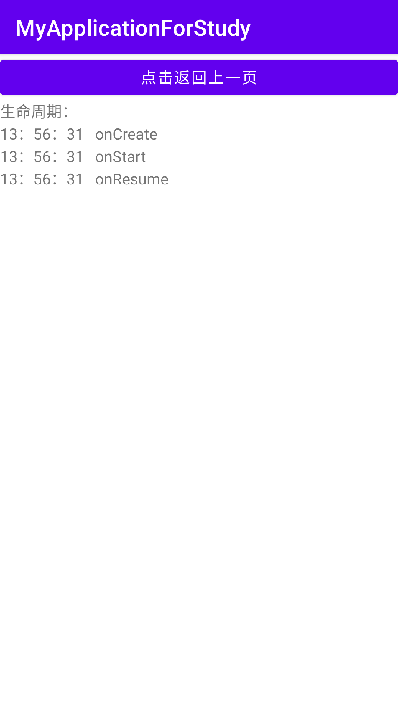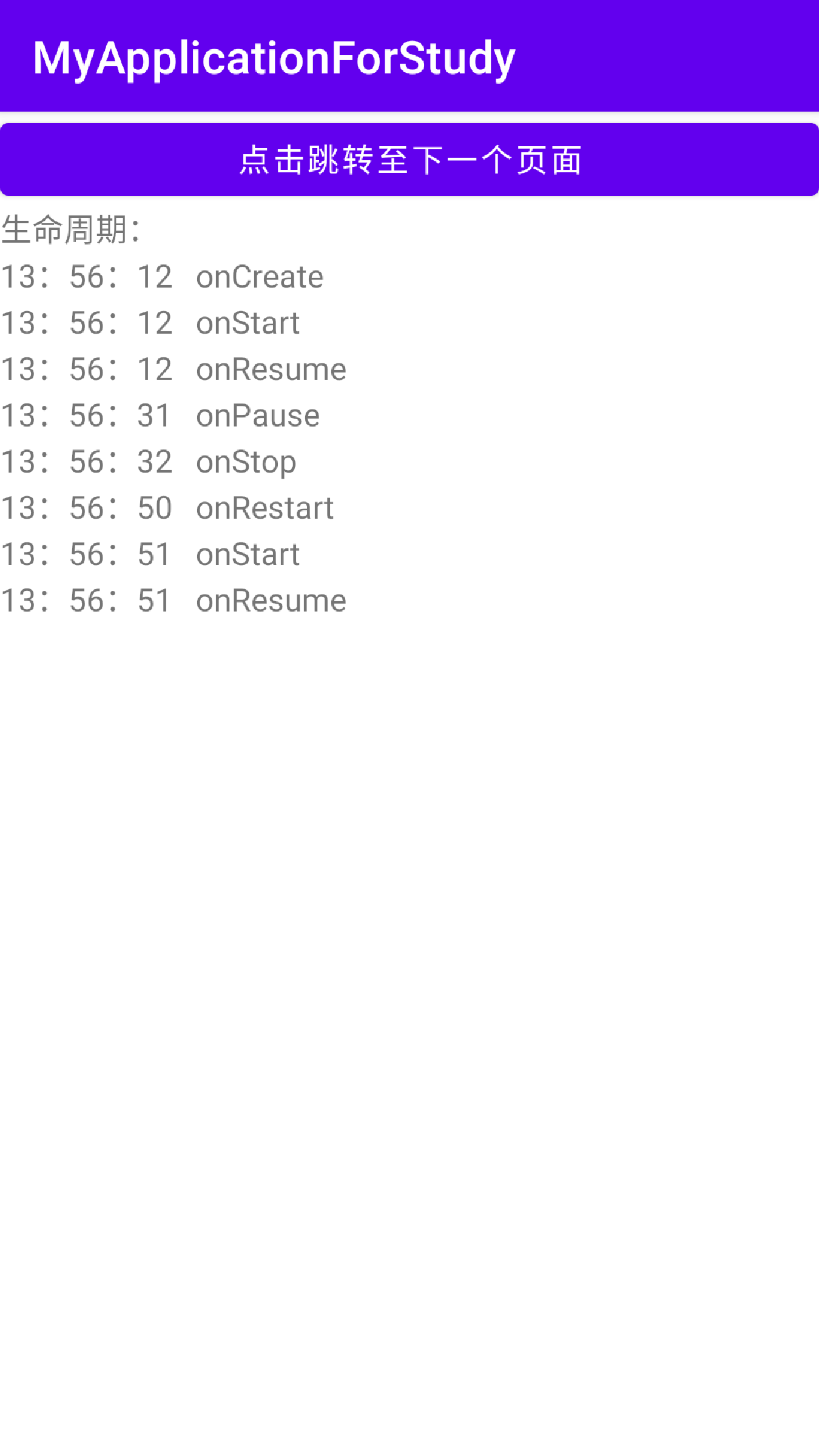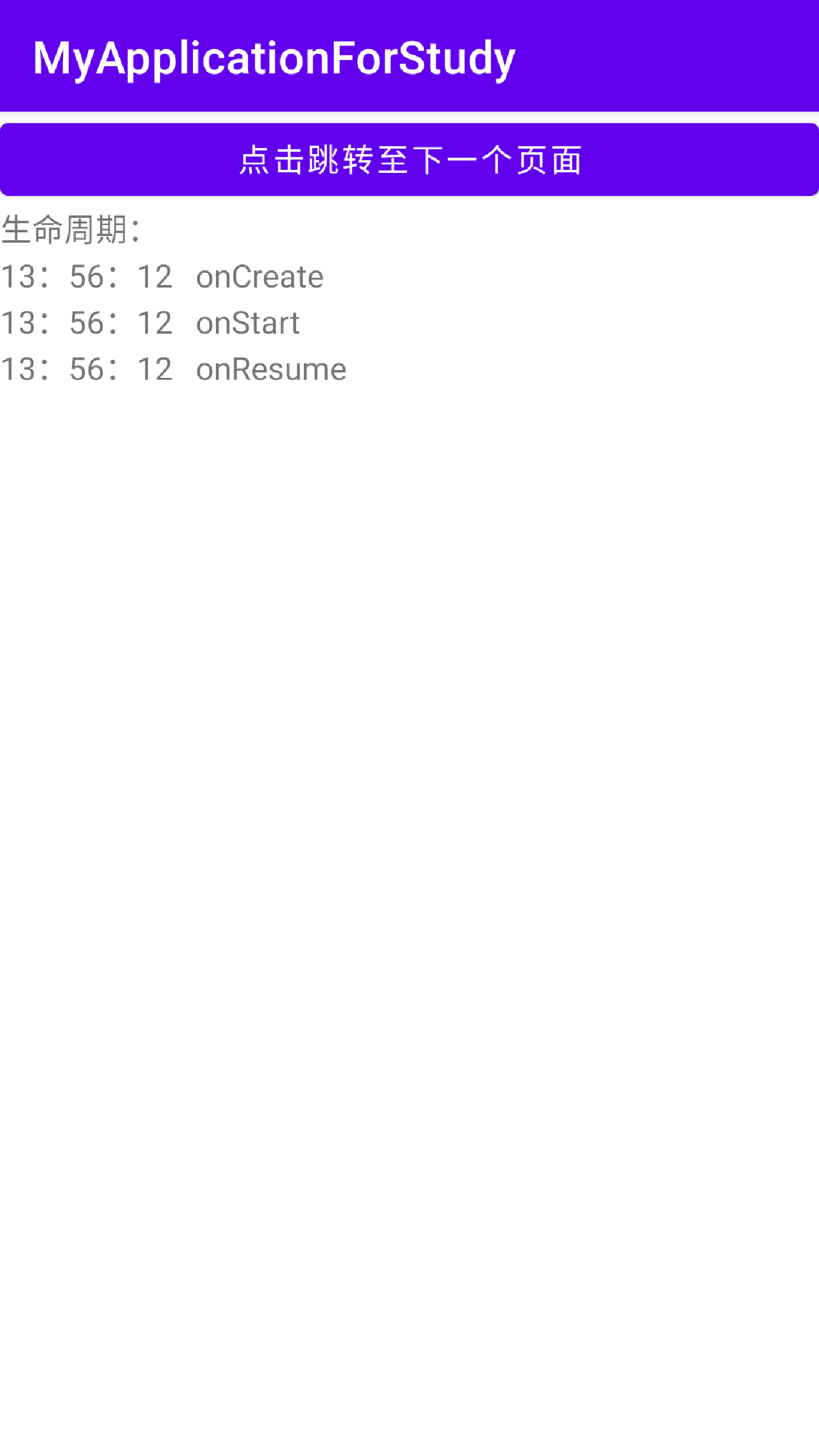 效果图如下,第一张为进入第一个页面,第二张为跳转至第二个页面,第三张为返回第一个页面。可以大致看出页面的生命周期。