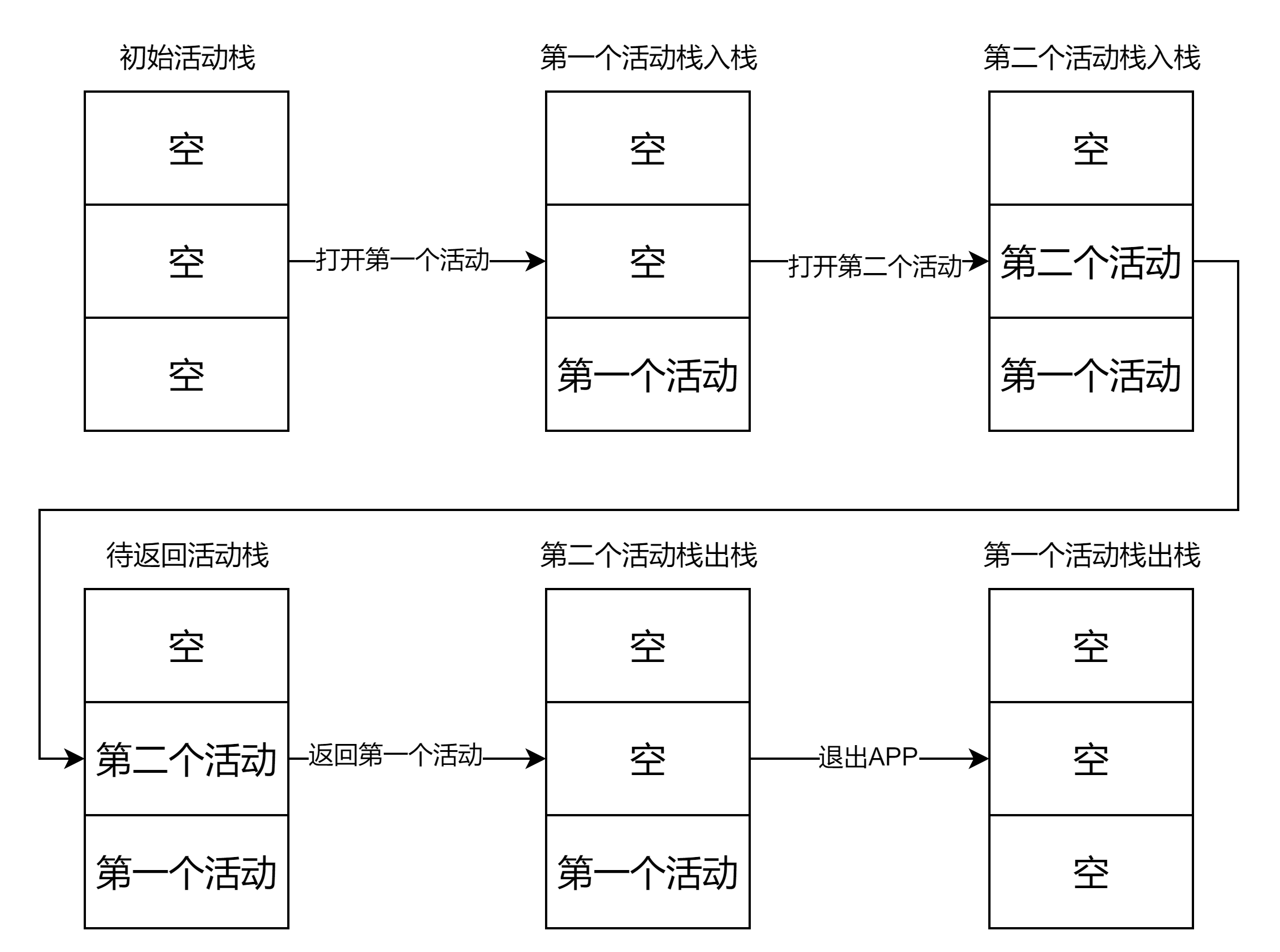 上面讲过两个页面之间的跳转,那么为什么从第二个页面返回时是回到第一个页面而不是返回桌面呢?这是因为系统给每一个正在运行的APP分配了活动栈,栈内容纳着已经创建但还未被销毁的页面信息。而栈是一种先进后出、后进先出的数据结构,所以当启动第一个页面时它入栈且在栈顶,当跳转至第二个页面时它在第一个页面后面且在栈顶。当销毁第二个页面时它出栈此时的栈顶为第一个页面,所以会返回到第一个页面而不是桌面。如下图所示。