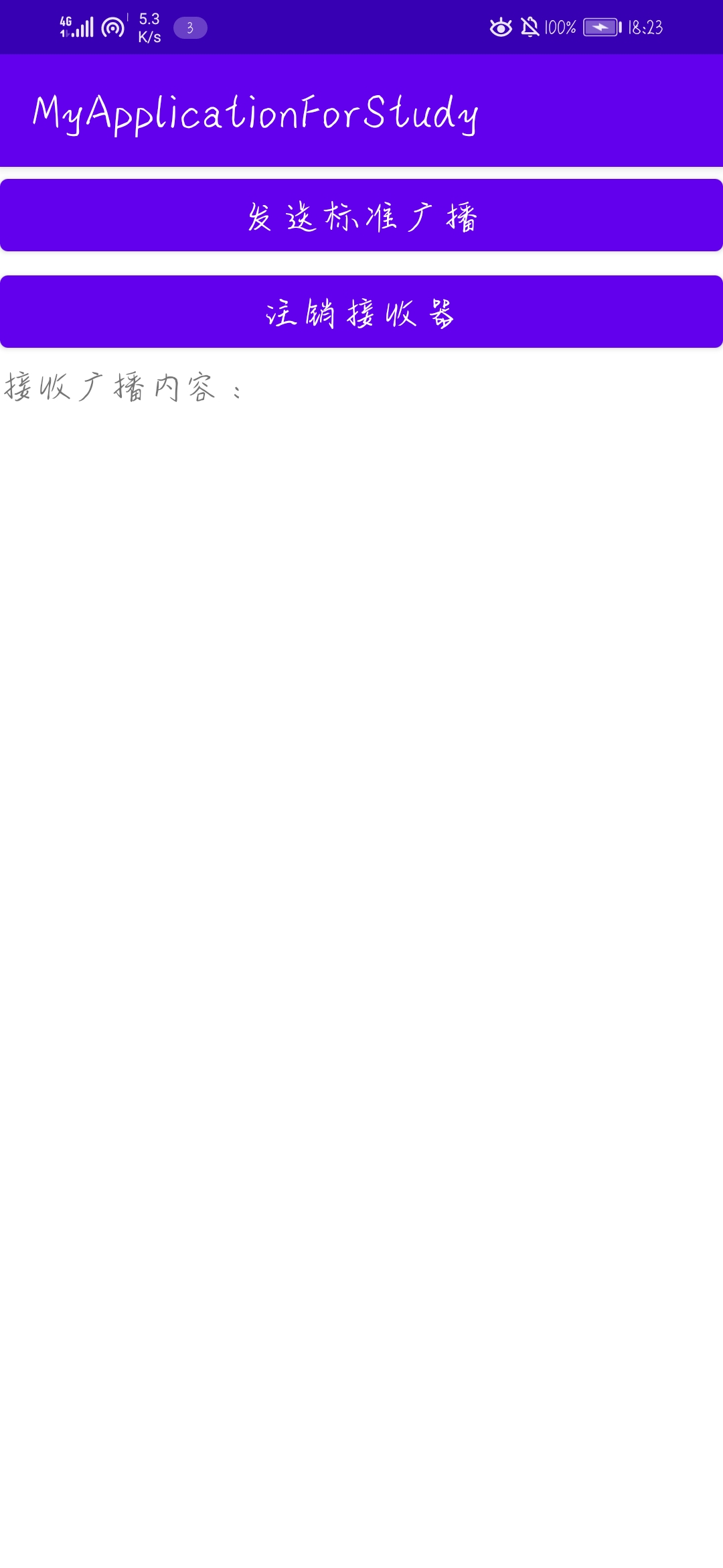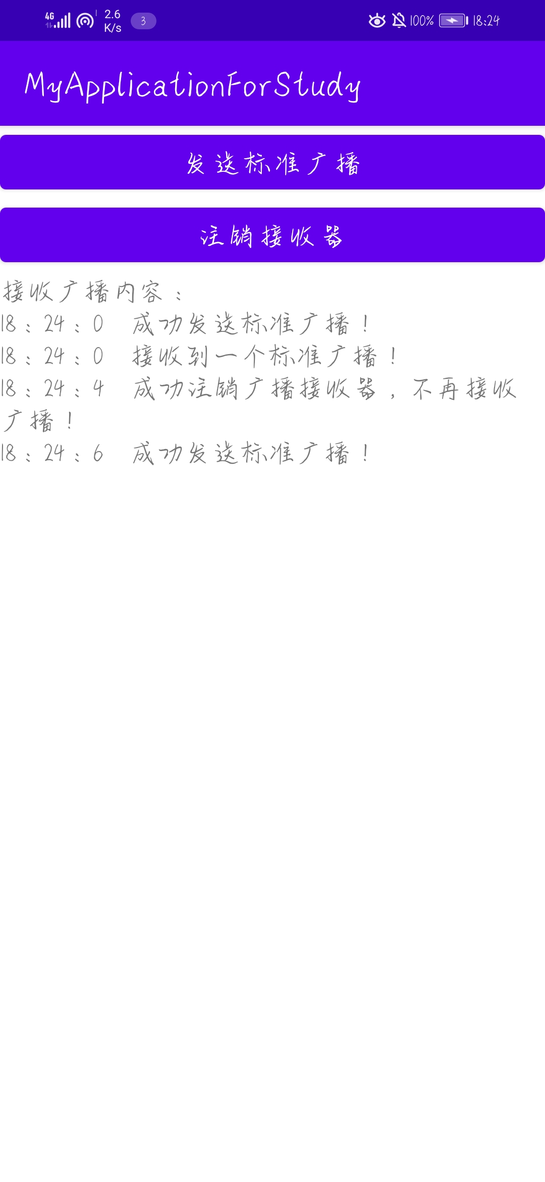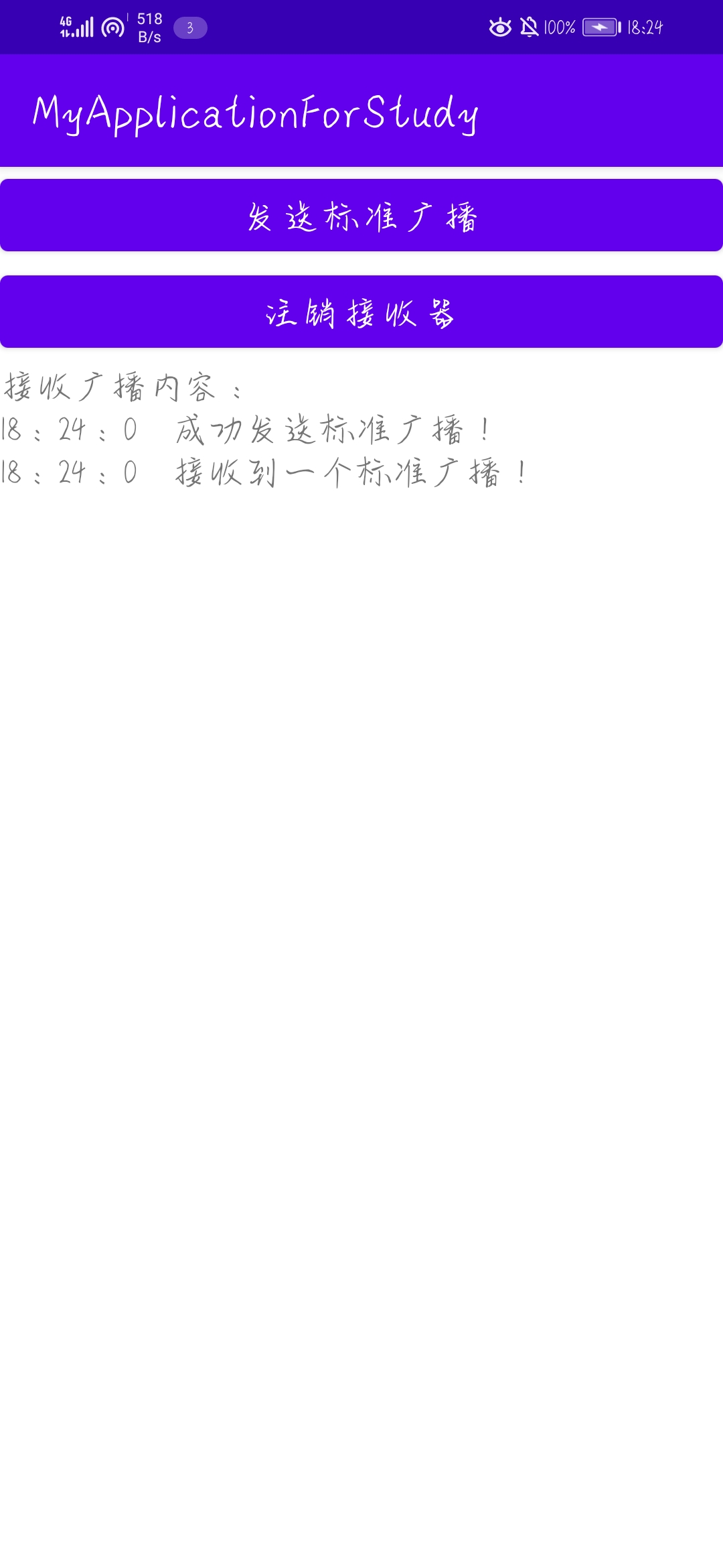 效果图如下,第一张为初始状态,第二张为发送一次标准广播,第三张为注销接收器后发送一次标准广播。可以看到注销接收器后再发送广播就不再接收到广播。