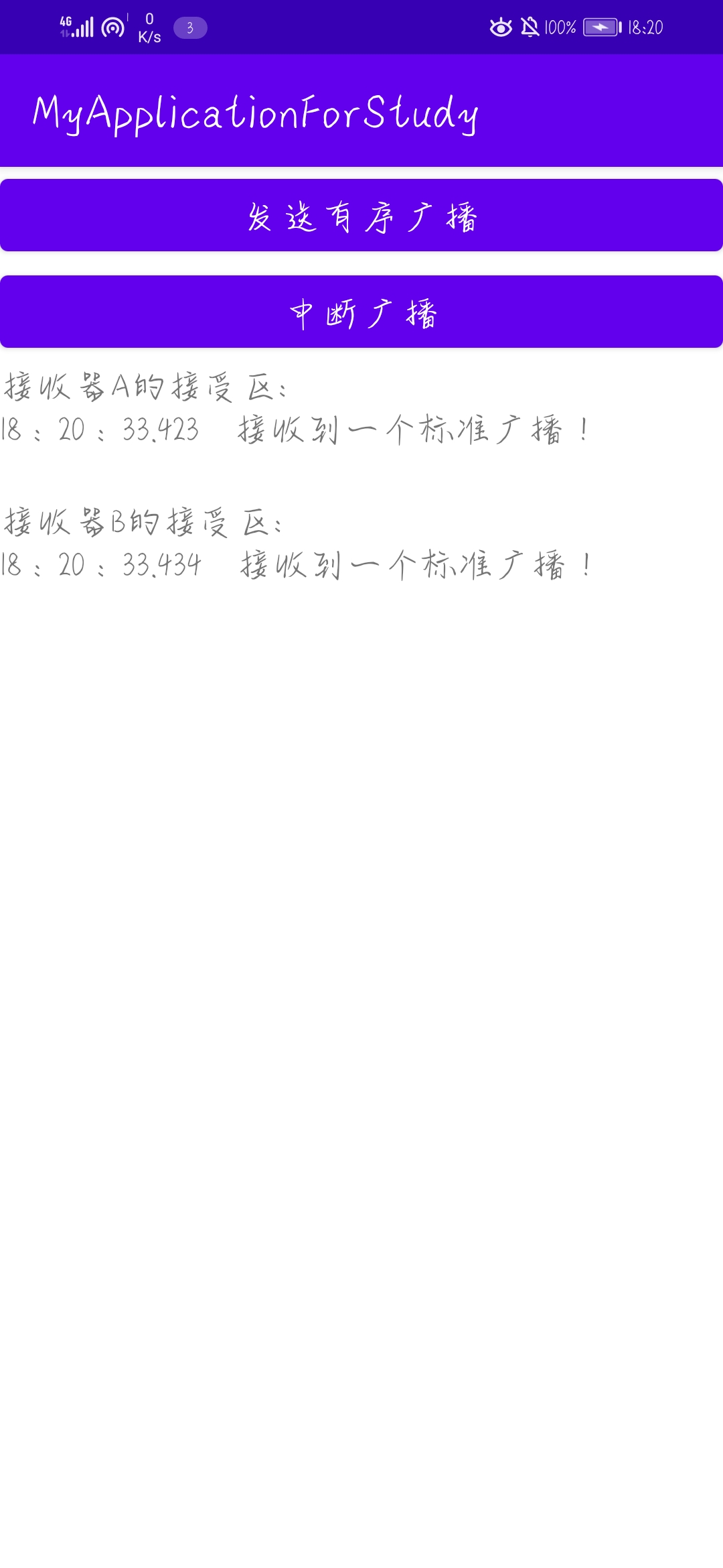 效果图如下,第一张为初始状态,第二张为发送一次有序广播,第三张为中断广播。可以看到A先接收到有序广播,中断时只有A接收到有序广播。