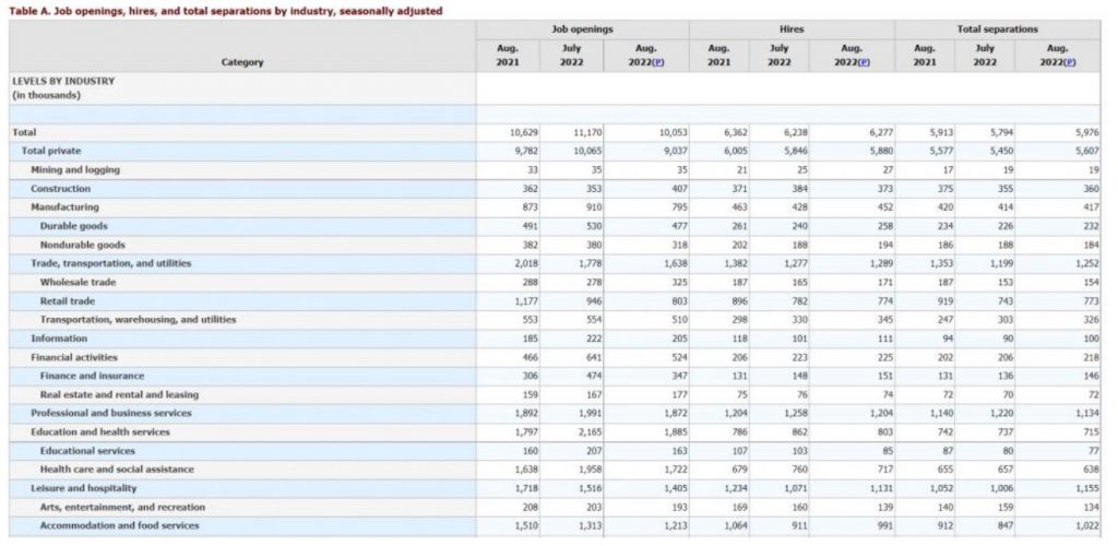 然而,投资者似乎将美国经济疲软的迹象视为对市场的积极迹象。例如,美国劳工统计局报告显示职位空缺的数量从比上个月的 1117 万下降到1005.3 万。因此经济衰退的明显迹象可能会迫使美联储重新考虑其政策。