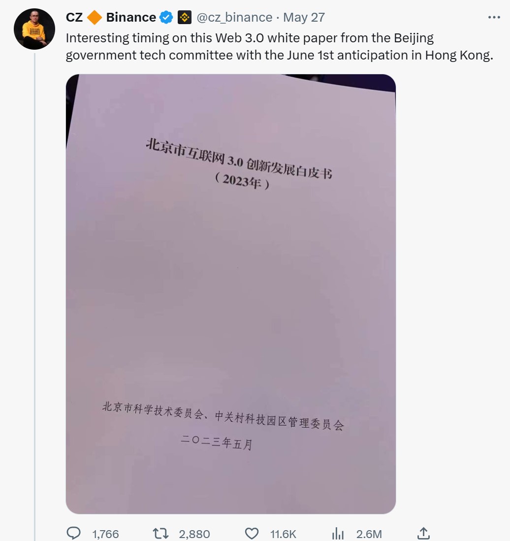 币安创始人CZ在推特上转发相关信息并评论,“北京市科技委员会发布了一份有关Web3.0的白皮书,与此同时,中国香港也在期待6月1日的到来。这两件大事接连发生,时间点上很有趣。”
