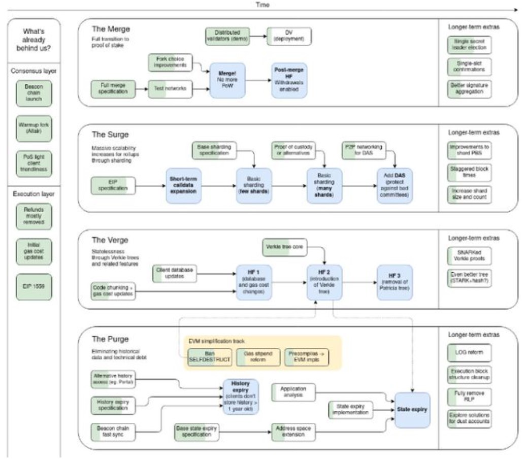 目前,以太坊已经完成了"The Merge"(合并)和上海Shapella升级,实现了从工作量证明(POW)到权益证明(POS)的转变。以太坊路线图显示,未来还会有更多的重大升级计划。