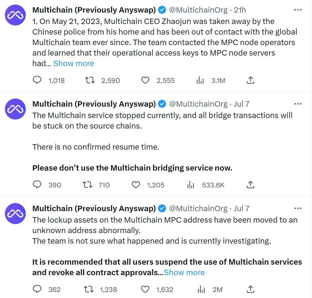 令人想不到的是,7月14日,Multichain在推特上发布回应所发生的一切。官方称,CEO赵军5月21日在中国被警方从家中直接带走,自此之后,全球的Multichain执行团队便与他失去联系,团队立刻联系上MPC节点运营商,得知他们对MPC节点服务器的操作权限密钥已被撤销,而实际上这些节点都是在赵军的个人云服务器账户下运行,团队也无法登入。