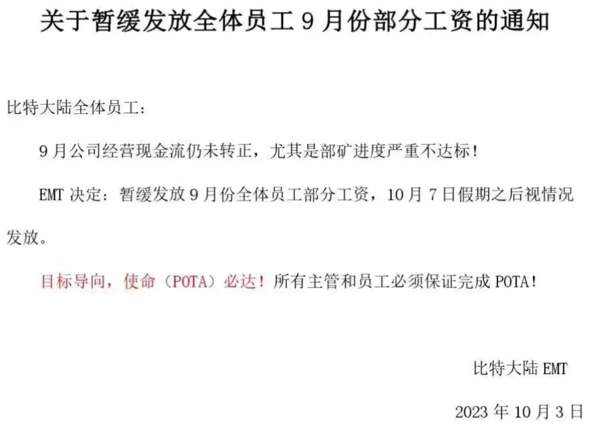 近日,一则关于比特大陆暂缓发放9月份全体员工部分工资的消息在网上流传。比特大陆对员工称公司营运现金流尚未转正,尤其是部矿(部署矿机进矿场)进度严重不达标,决定暂缓发放9月份全体员工部分公司,10月7日后视情况发放。