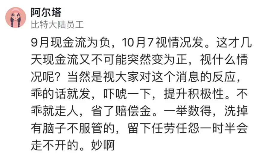 脉脉上多名比特大陆员工爆料,所有员工的9月份绩效奖金全部取消,基本工资砍半发放,甚至2022年的年终奖至今都没有发,而被扣掉的工资不知道啥时候才能发,恐怕要到「资金流回到正值」时才能发放。