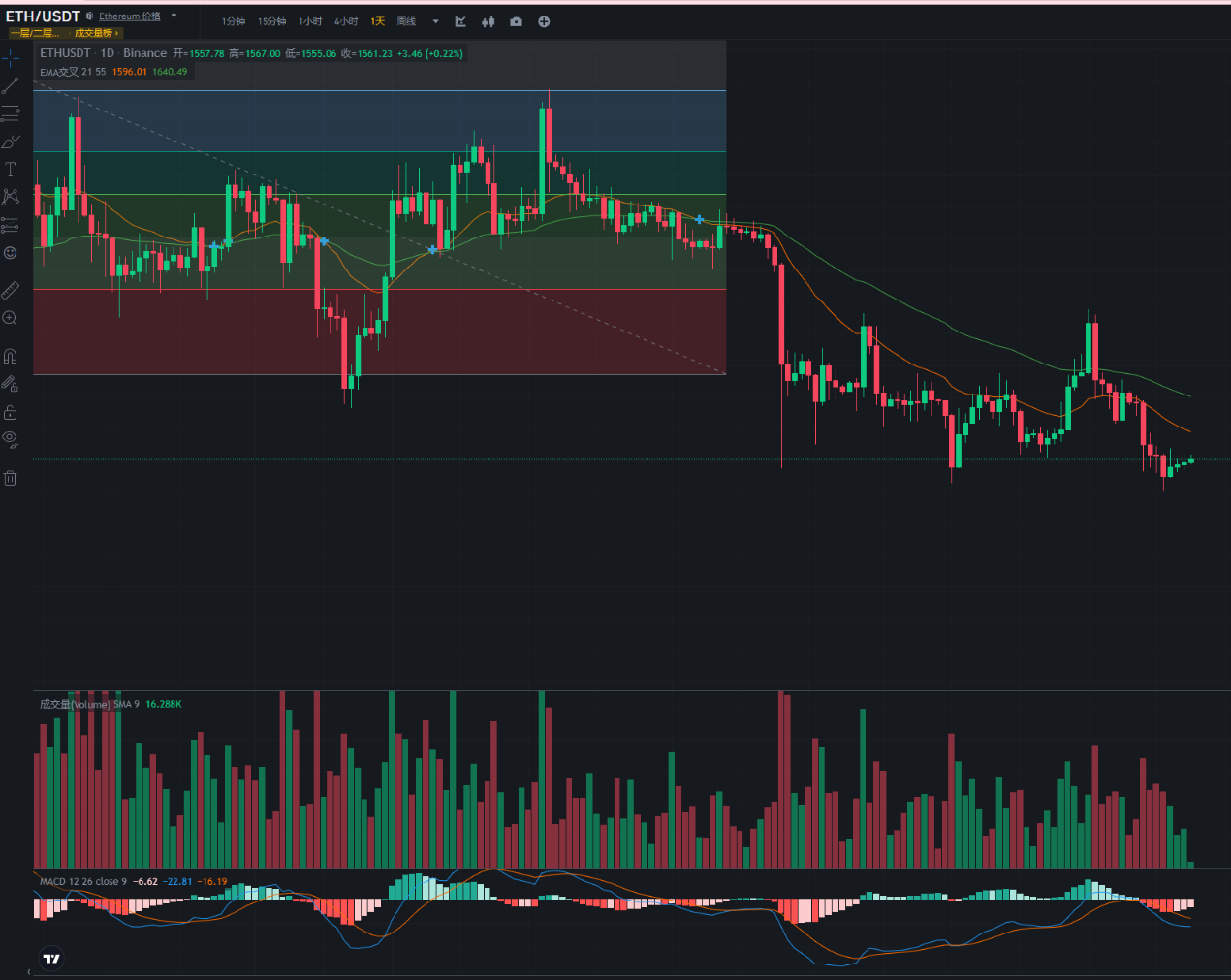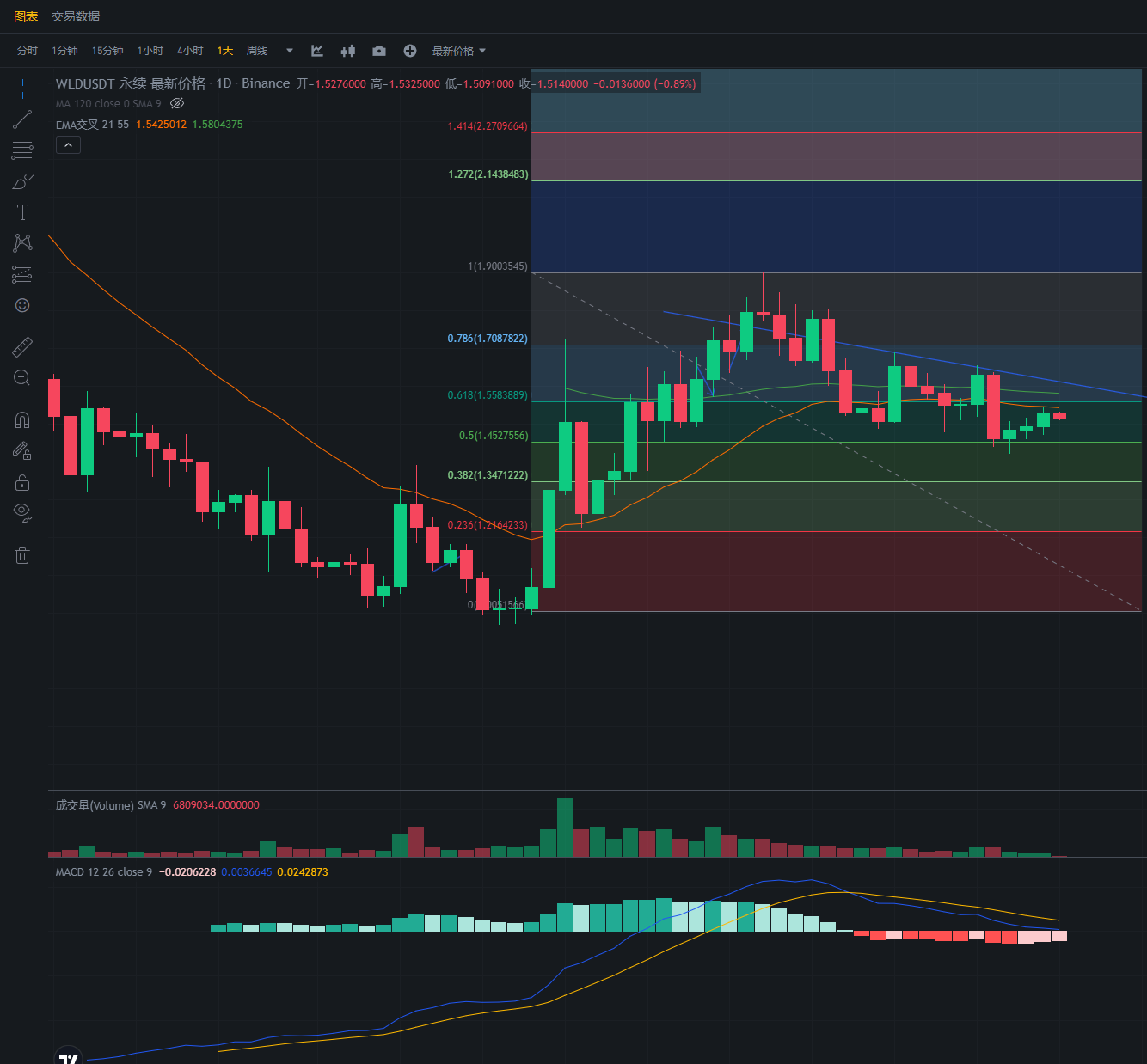 WLD前面三天上涨回调,今天目前可以加仓空单。这是属于正常的因为急速下跌,而导致的回调,目前依然按照下行趋势,空单持有者继续等待。