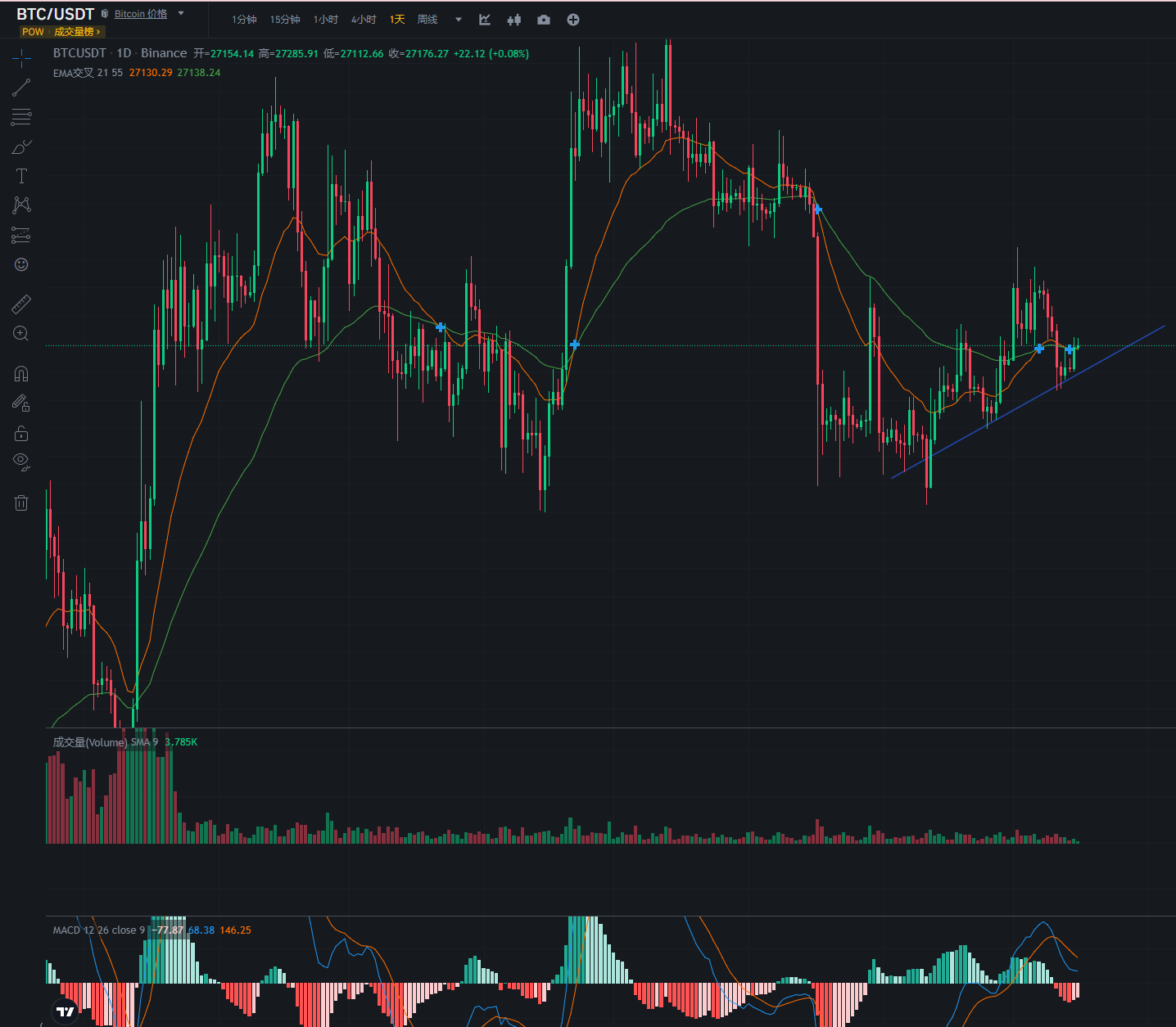 目前大饼再次止稳,并开始向上攀升,目前MACD来看也是进入了多头趋势。重新调整了蓝色上涨趋势线,目前来看这次的低点并没有跌破上一个低点,可以认为是上涨的中继。注意白天的下跌回调。