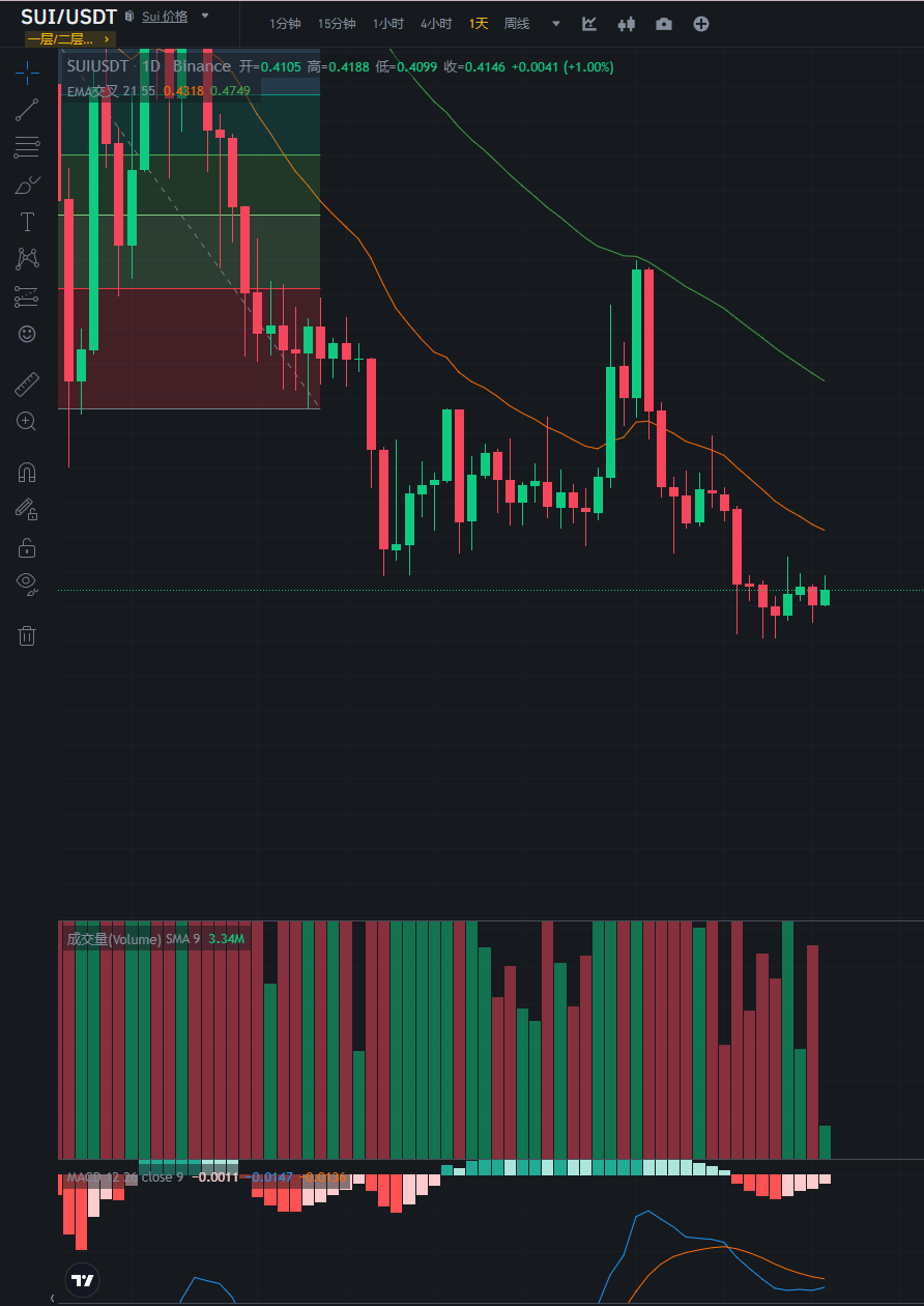 接下来看看山寨行情,SUI目前处于震荡行情,MACD出现4连红色空心柱,但是盘面还是震荡,说明空头力量还是强劲。不建议做多,如果手上还有空单的,可以逢高做空。