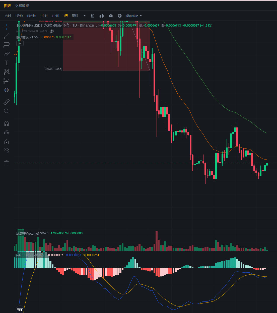 Pepe目前反弹厉害,但是成交量很小,而当前的价格也是适合做空的,没有空单的可以入场一部分空单。一定要把仓位留够,后续如果上涨还可以继续加仓。