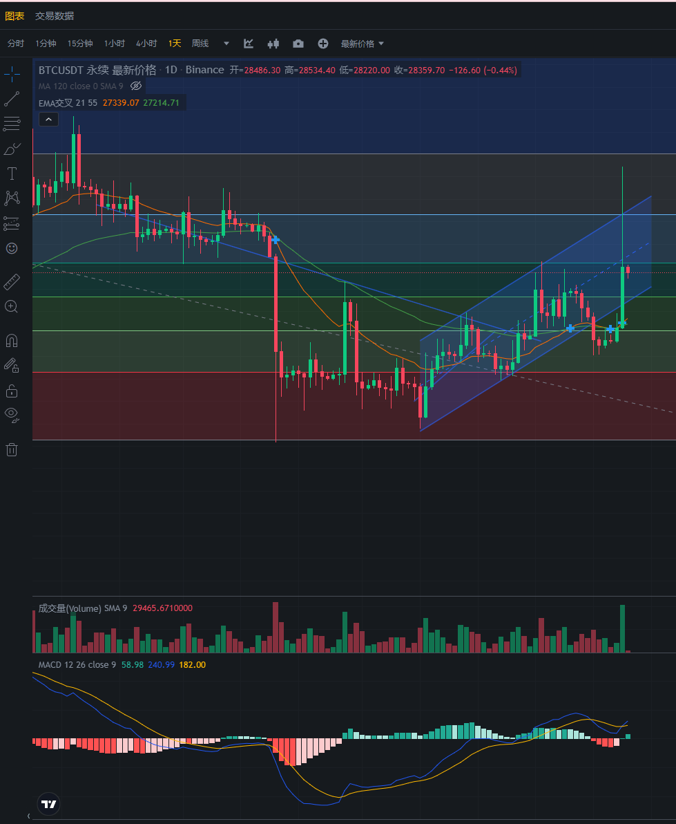大饼昨日在受到假消息美国证券交易委员会(SEC)通过大饼ETF后迅速上涨,一度上涨到30000,而很快回落到28000附近。从MACD日线来看,现在完全进入多头趋势,同时大饼再次进入蓝色上涨趋势线,目前按照预期上涨结束,接下来将是震荡下跌,建议可以入仓空单。要注意白天的下跌回调,注意晚上SEC公布是否继续延迟大饼的ETF,目前来看大概率延迟 。