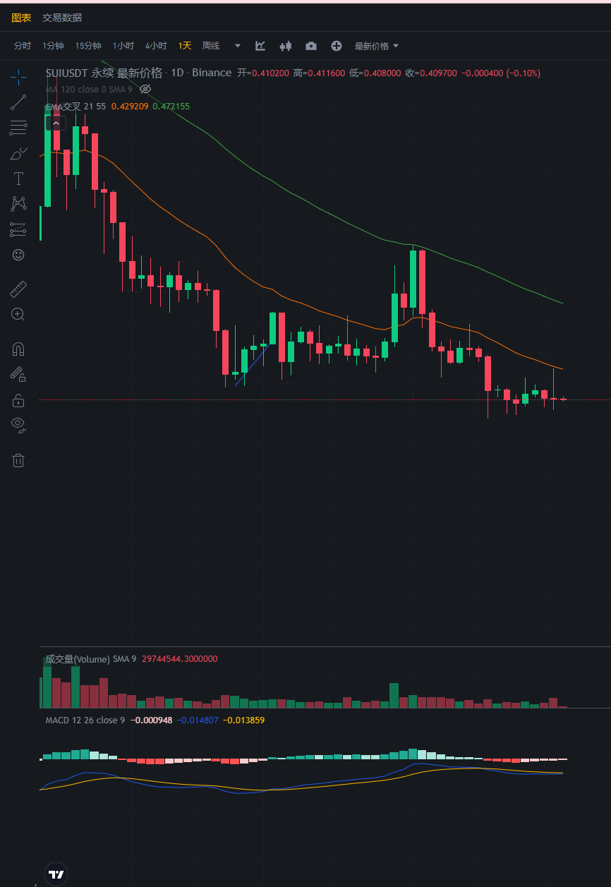 接下来看看山寨行情,目前SUI依然是弱势,非常适合空单。昨日的上涨连EMA21均线都没有触碰就下跌回去了,空单的可以继续持有。