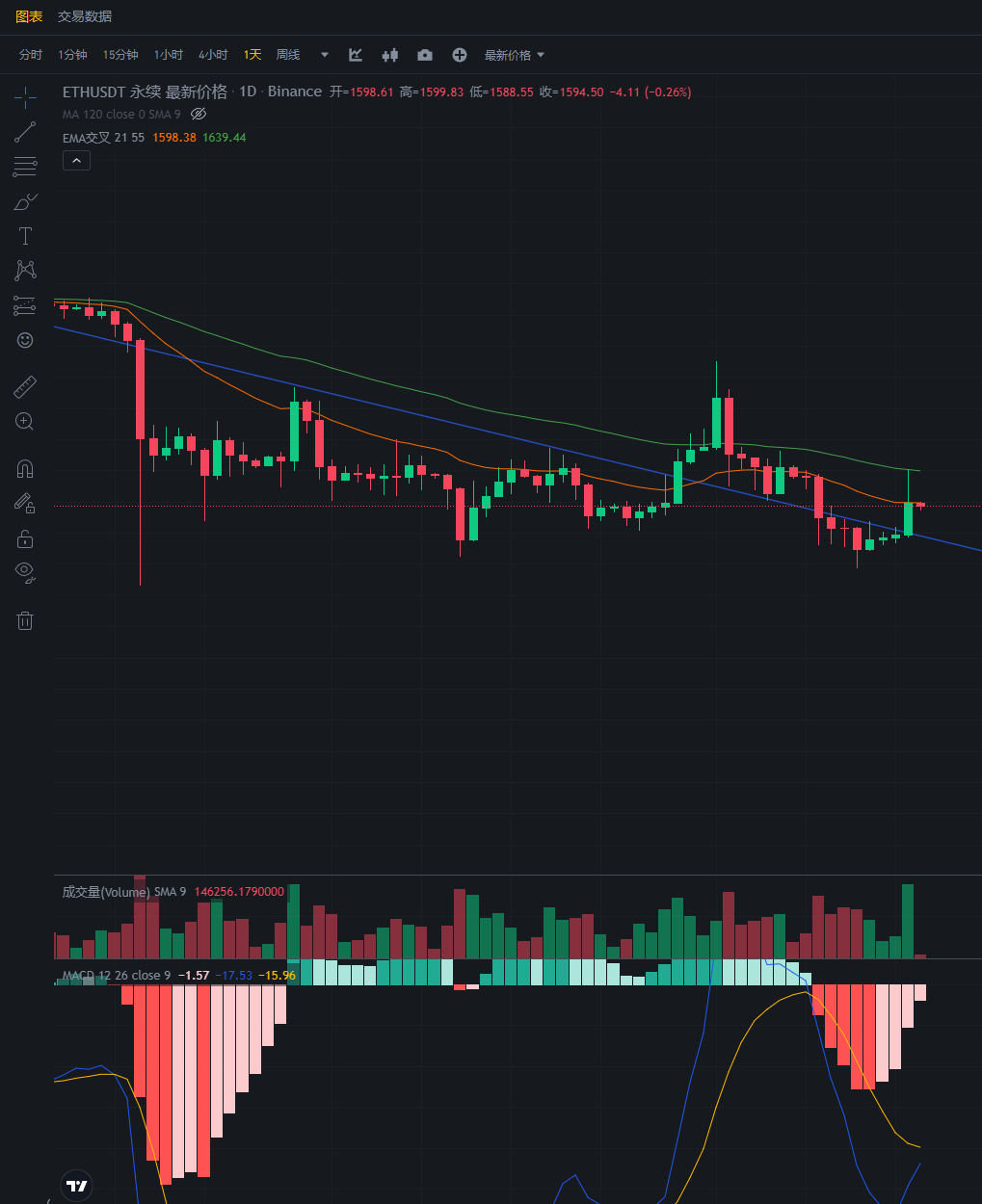 以太就不如大饼强势,昨日仅仅向上触碰了EMA55均线,目前价格低于1600,可想而知以太目前有多弱。依然建议空单以太,注意今日白天下跌回调。