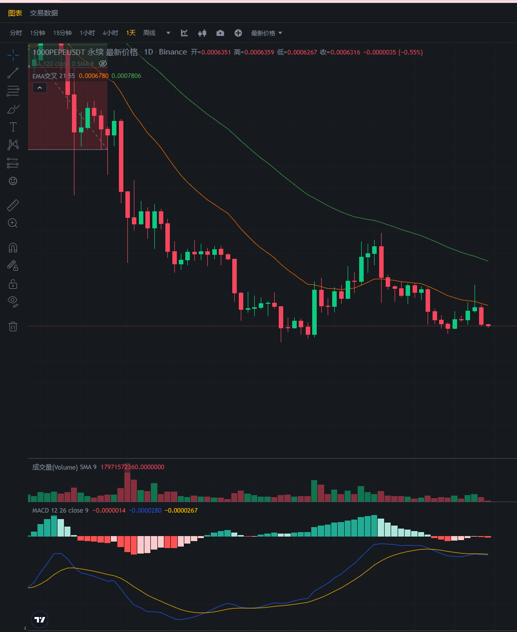 Pepe目前如期下跌,而且比较弱势,预计后续还要继续下跌。止盈点放在0.0006-0.00058-0.000055。