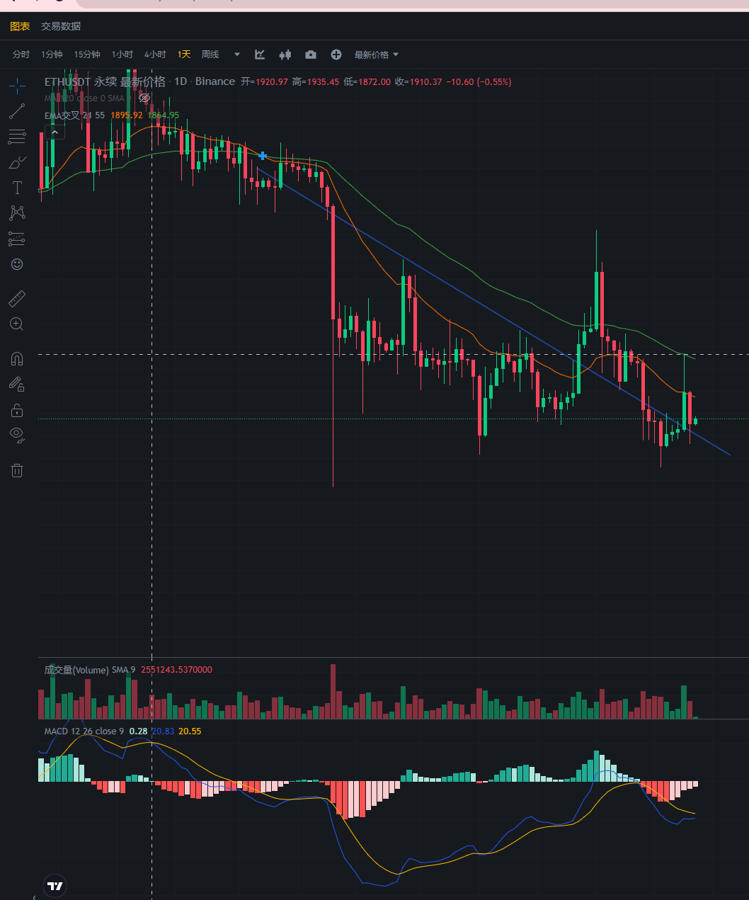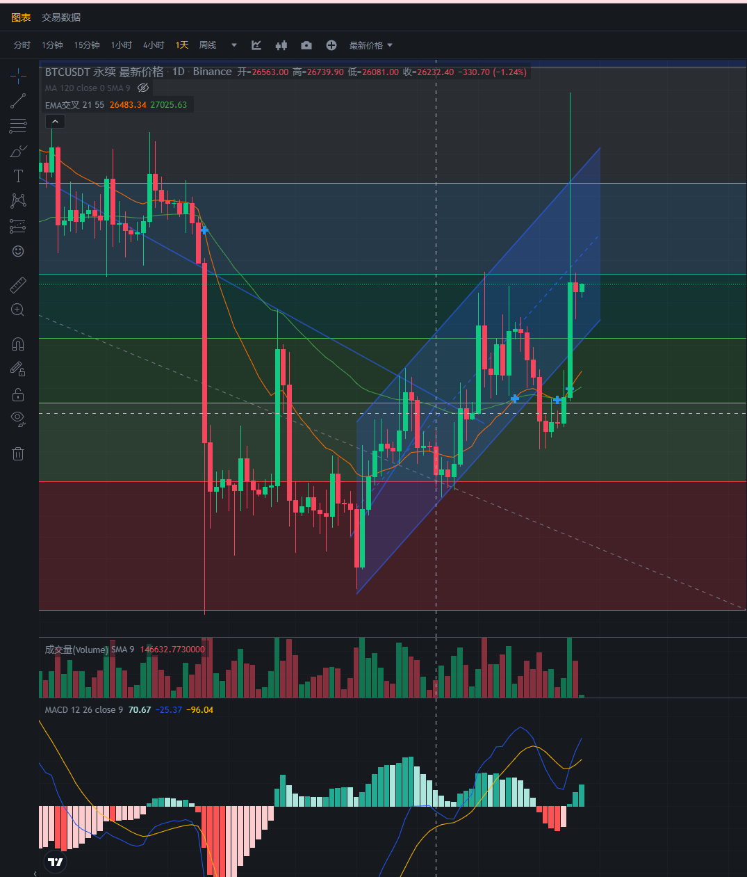 大饼昨日小幅度的下跌回调了,很快又上涨。目前看下来震荡向下刚刚开始,可以关注后续情况。大饼依然保持看空不做空,目前除了独立行情的币,就大饼非常强势。目前从MACD日线来看,还是保持多头趋势,预计明后两天将要开始变盘。注意白天山寨的下跌,近期山寨被大饼吸血。