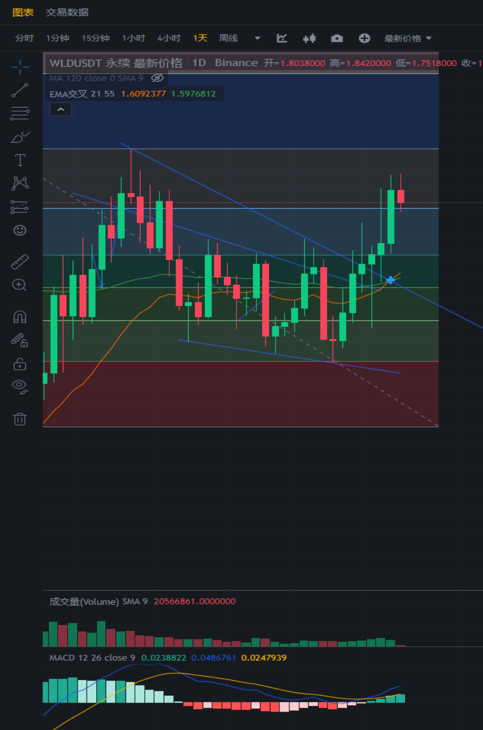 WLD目前也和之前一样,连续上涨了6天,最近跟着大盘上涨,目前来看依然不建议空单入场。后续山寨季的到来,可能会继续上涨。今日有所下跌,目前还没有看到大盘震荡或者下跌的迹象。同时EMA21均线和EMA55均线也金叉了,后续等待震荡再考虑。