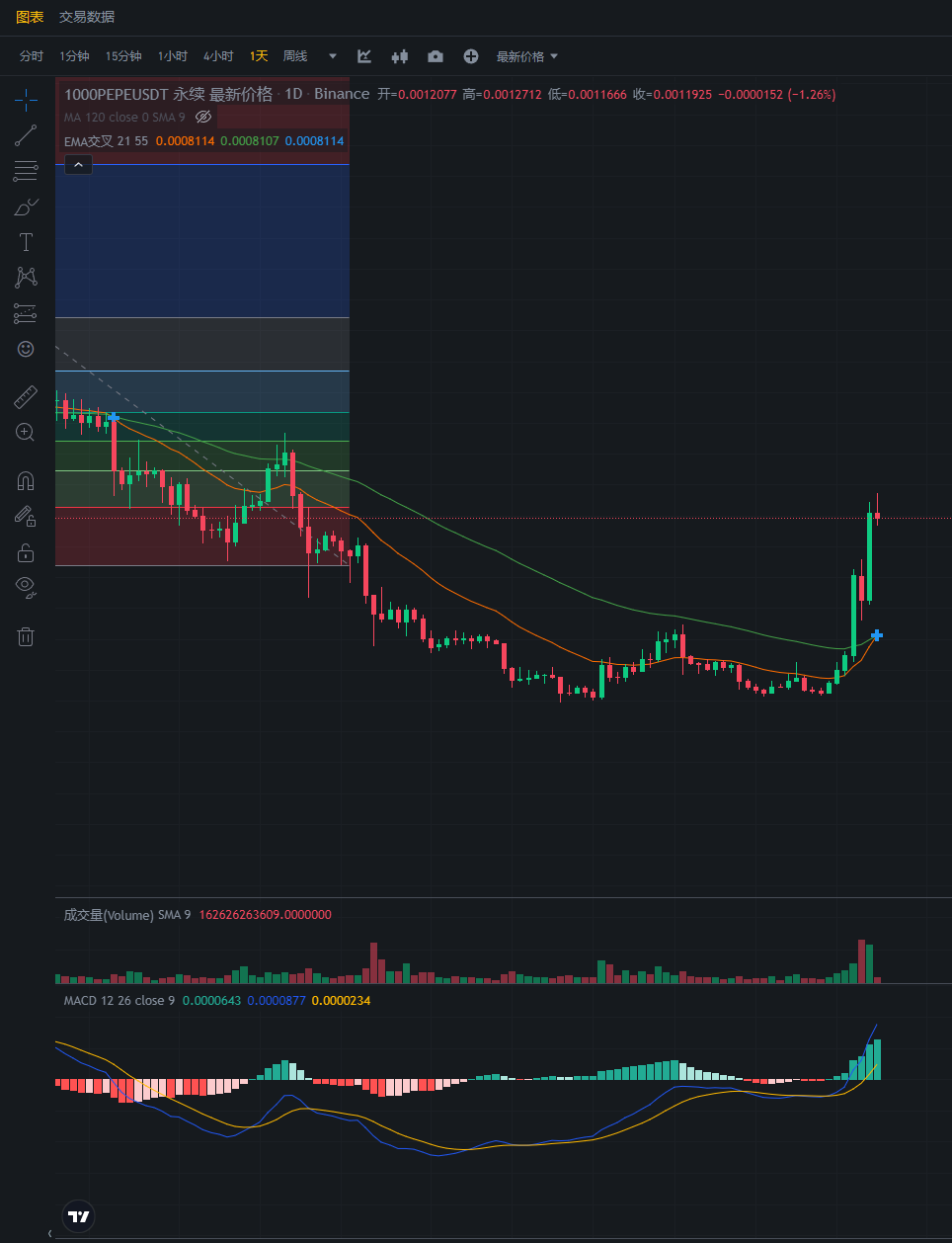 接下来看看山寨,Pepe昨日晚上又开始发力上涨,还是原来的预期,继续等待,空头休息。上一次shib在十月份上涨了10倍,pepe可能会是下一个。可以小仓位尝试入场多单。