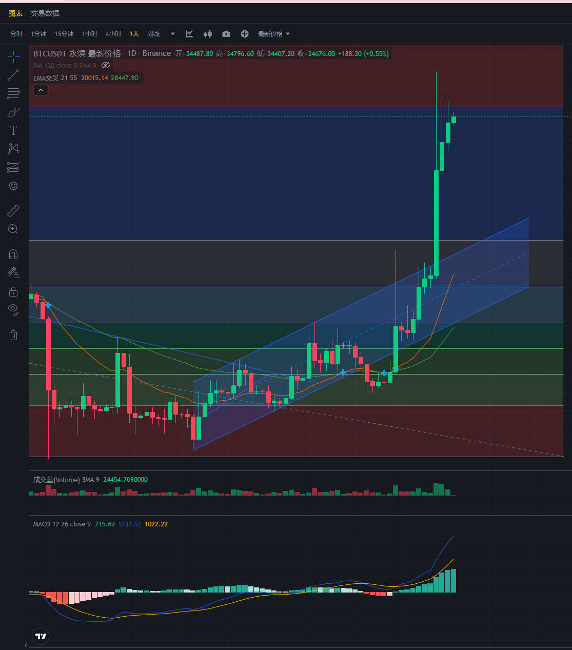 目前大饼继续上涨,还没有看到震荡盘整的迹象。从MACD日线来看,连续绿色实心柱已经11天。现在有点上涨无力了,而现在入场做空性价比更高,看反弹到33000-32000,止损36000。如果谨慎点,可以继续等待回调后做多。首先币圈处于独立行情,外部传统资金并没有进入,而是场内情绪引发的上涨,这种fomo情绪难以长时间维持。因此近期内应该会有回调动作。