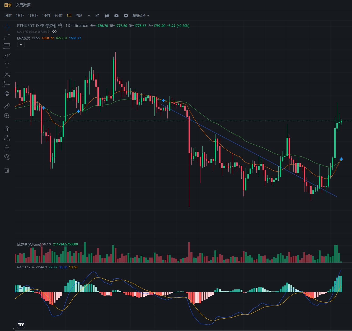 弱势的以太姗姗来迟,EMA55均线和EMA21均线终于金叉,而上涨幅度远小于大饼。后续大饼震荡后,以太预计会发力上涨。目前还是要以看多为主,目前的行情是属于多头。