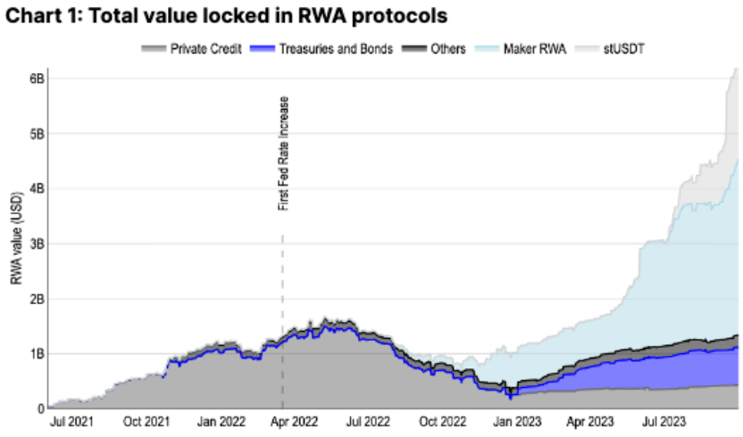 而从2022年年底至今,代币化概念已经悄然复苏,RWA(现实资产代币化)大行其道。有人称,代币化的复苏部分原因是美债抛售,因为在过去一年中,利率的上升反映在 RWA协议分配从私人信贷协议向美国国债的转移上。特别是,在Maker DAO存储的抵押品中,存放的RWA资产数量显著增长,已经铸造了超过30亿美元的DAI稳定币。