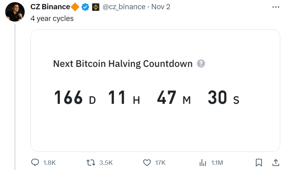 “4年周期,”赵长鹏在推特写道,附图标出比特币减半时间表,距今仅剩166天。为抑制比特币价格通胀,比特币网络的区块奖励大约每4年就会展开“减半”(Halving),而下一次的减半预期将在2024年4月发生。届时,比特币的产量将会减少,挖矿奖励从6.25枚比特币降至3.125枚比特币。