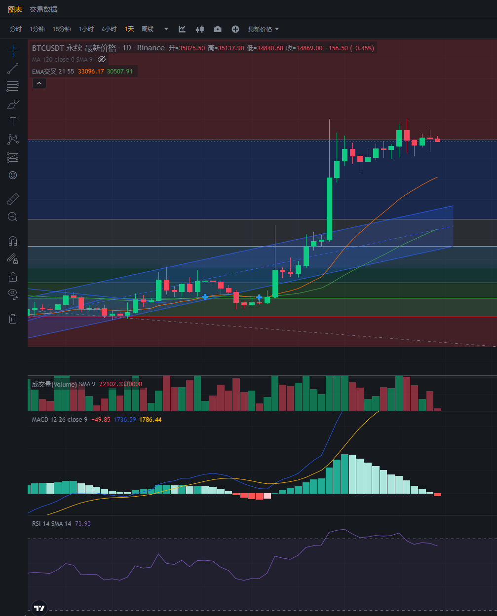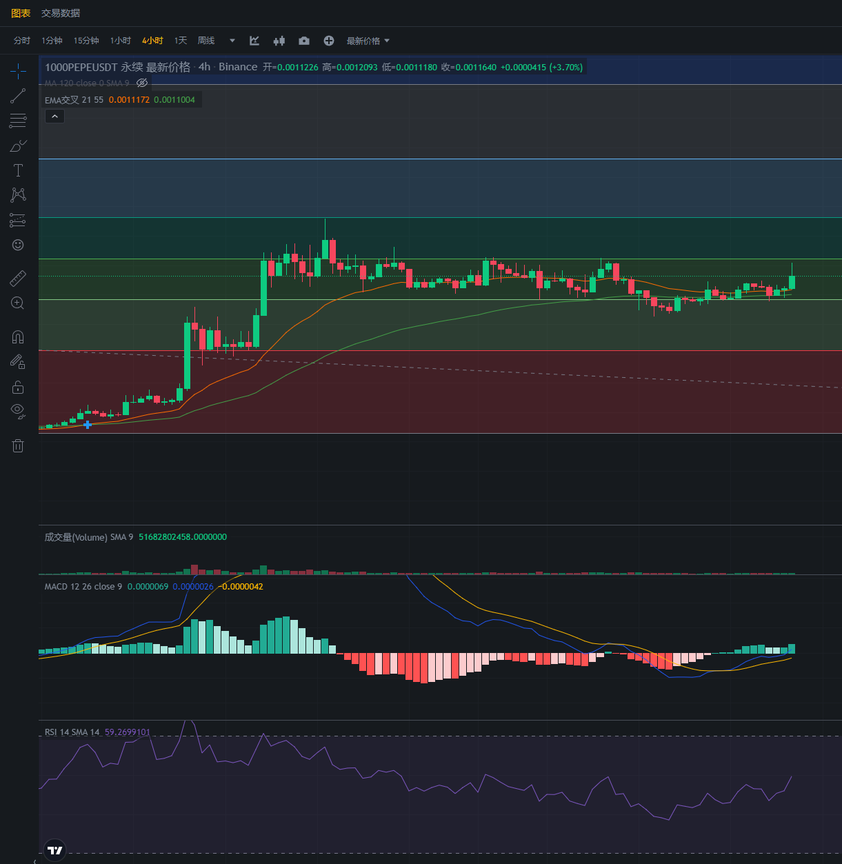 接下来看看山寨行情,Pepe目前从MACD4小时级别来看,后续还是要上涨的。周五上车的已经止盈落袋为安了。等待白天的回调,再入场多单。