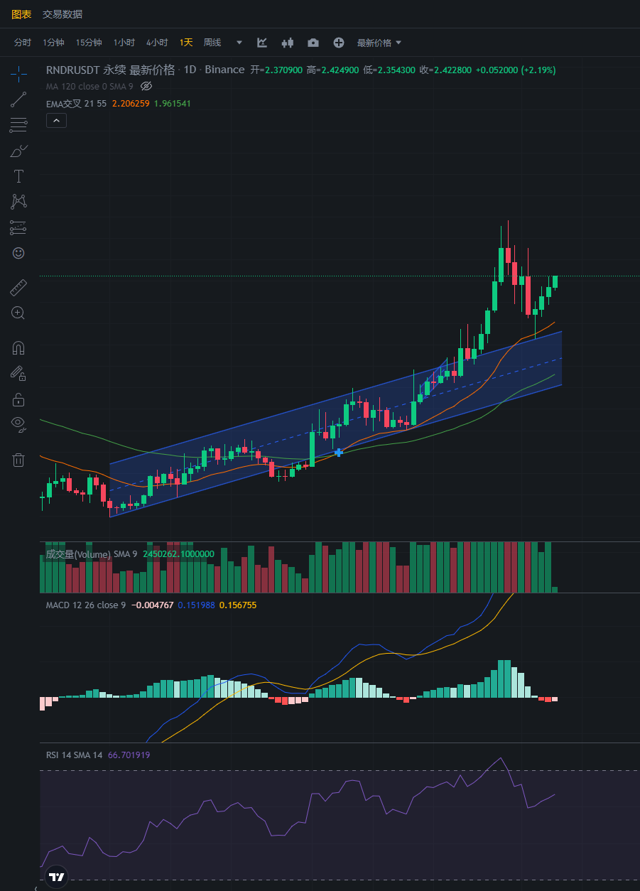 RNDR今日MACD开始呈现红色空心,说明多头强势。目前来看,RNDR是非常适合多单的,现在就是入场多单的好机会。