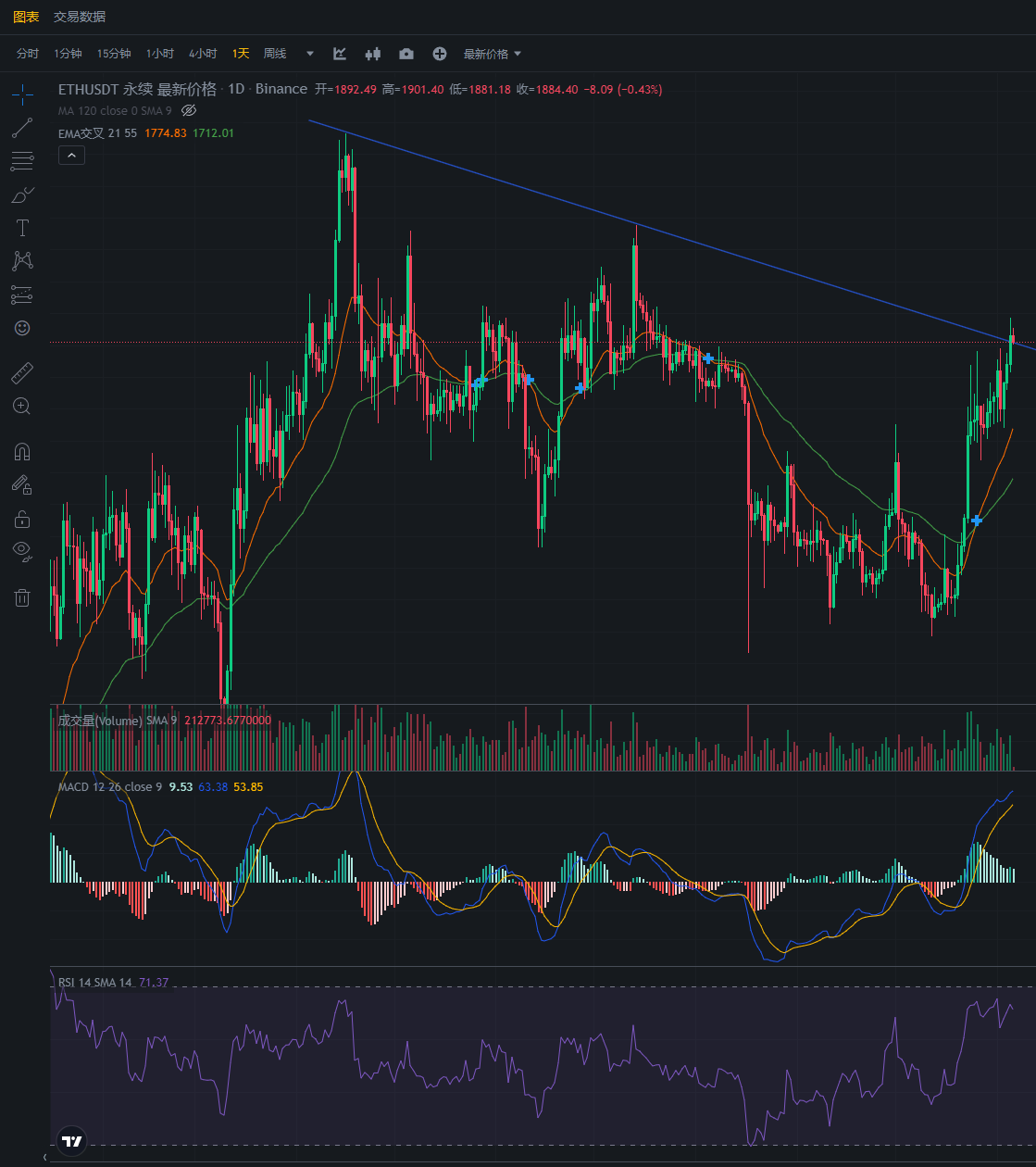 以太周五给的策略,入场的已经止盈了,现在已经达到1884,已经全部吃到了。今日早上上涨了,现在白天回调,等待机会上车。