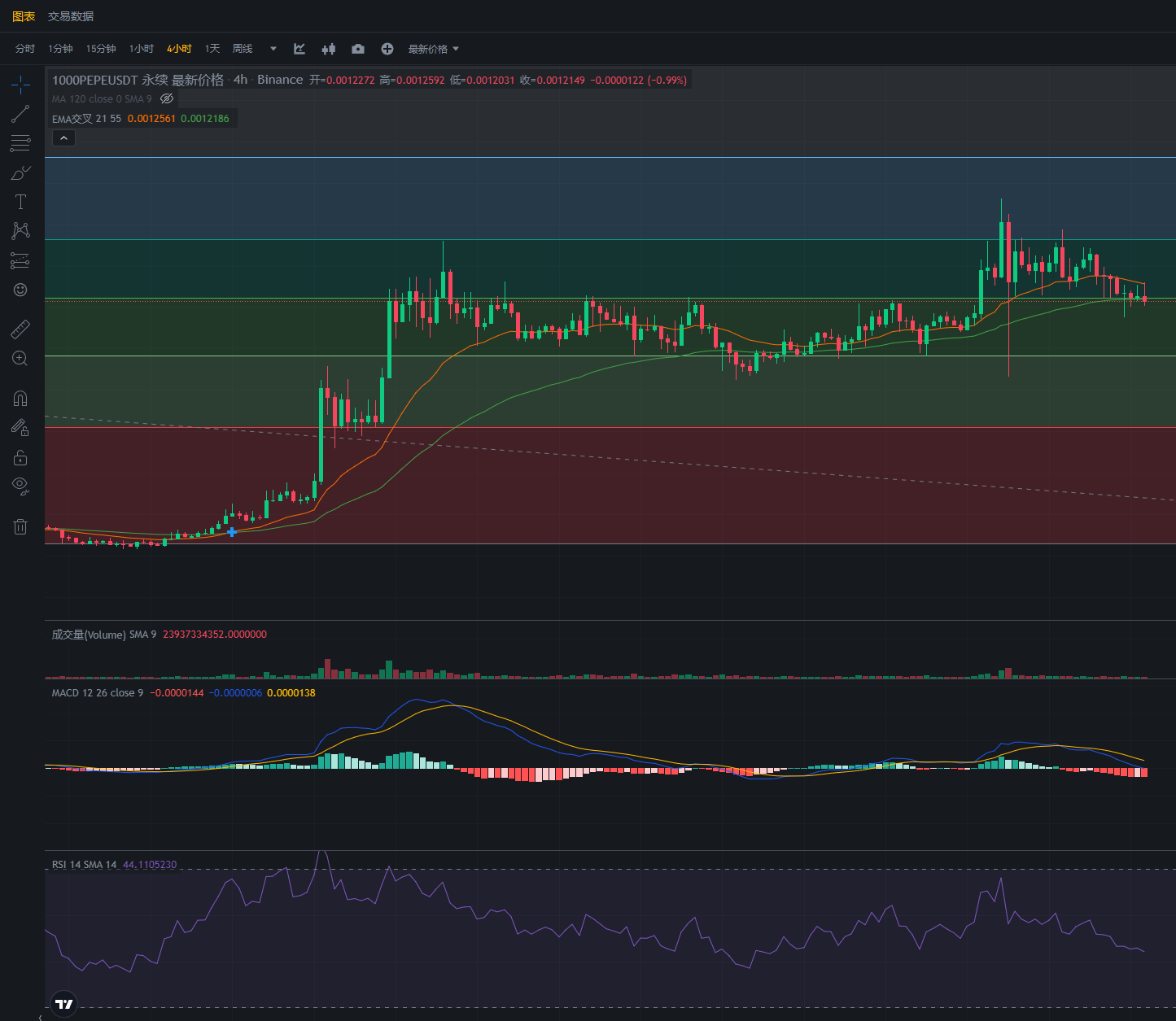 接下来看看山寨行情,Pepe目前已经跌破EMA55均线,回调机会来了,等待回调。可以入场空单。