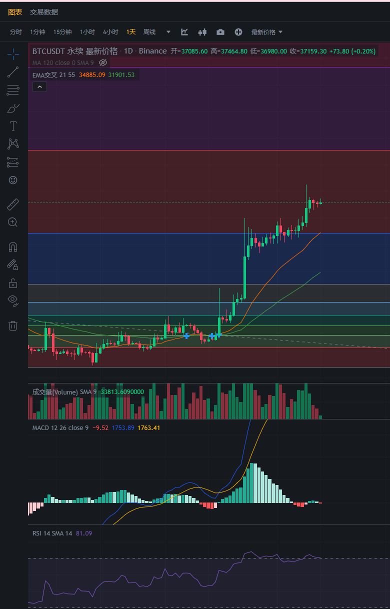 大饼上涨太快,又开始震荡,但上不去,所以目前来看差不多要做回踩动作,入场空单性价比较高。而且从MACD日线来看,也是进入空头趋势,RSI(14)也是进入了超买区间,值得入手空单。上周给的策略也是盈利的,可以反手入场空单。