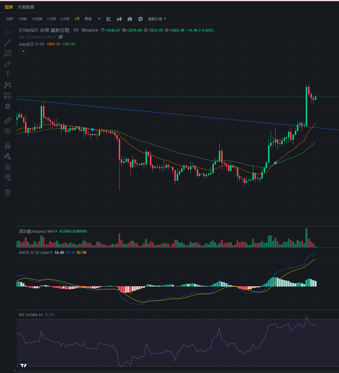 上周并没有做以太,目前从MACD日线来看,以太比大饼要强势,现在还是绿色空心柱,RSI(14)也没有进入超买区间,因此入场空单并不合适。