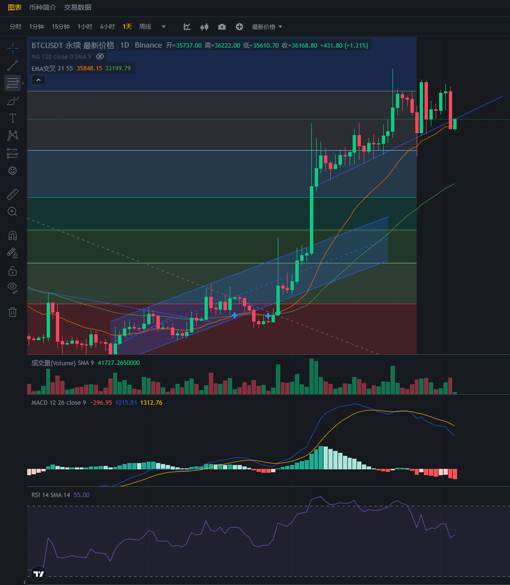 空单策略:入场36500 止盈34000-32000 止损39000