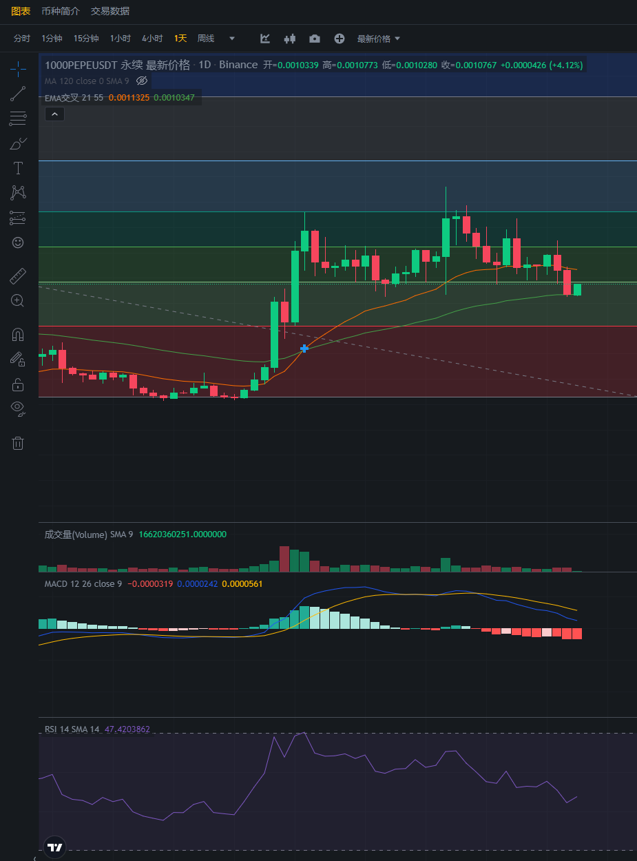 接下来看看山寨行情,PEPE目前处于盈利中,非常舒服,目前已经下跌到了0.00108,可以止盈下车了。昨日是下跌到EMA55做了回踩动作。