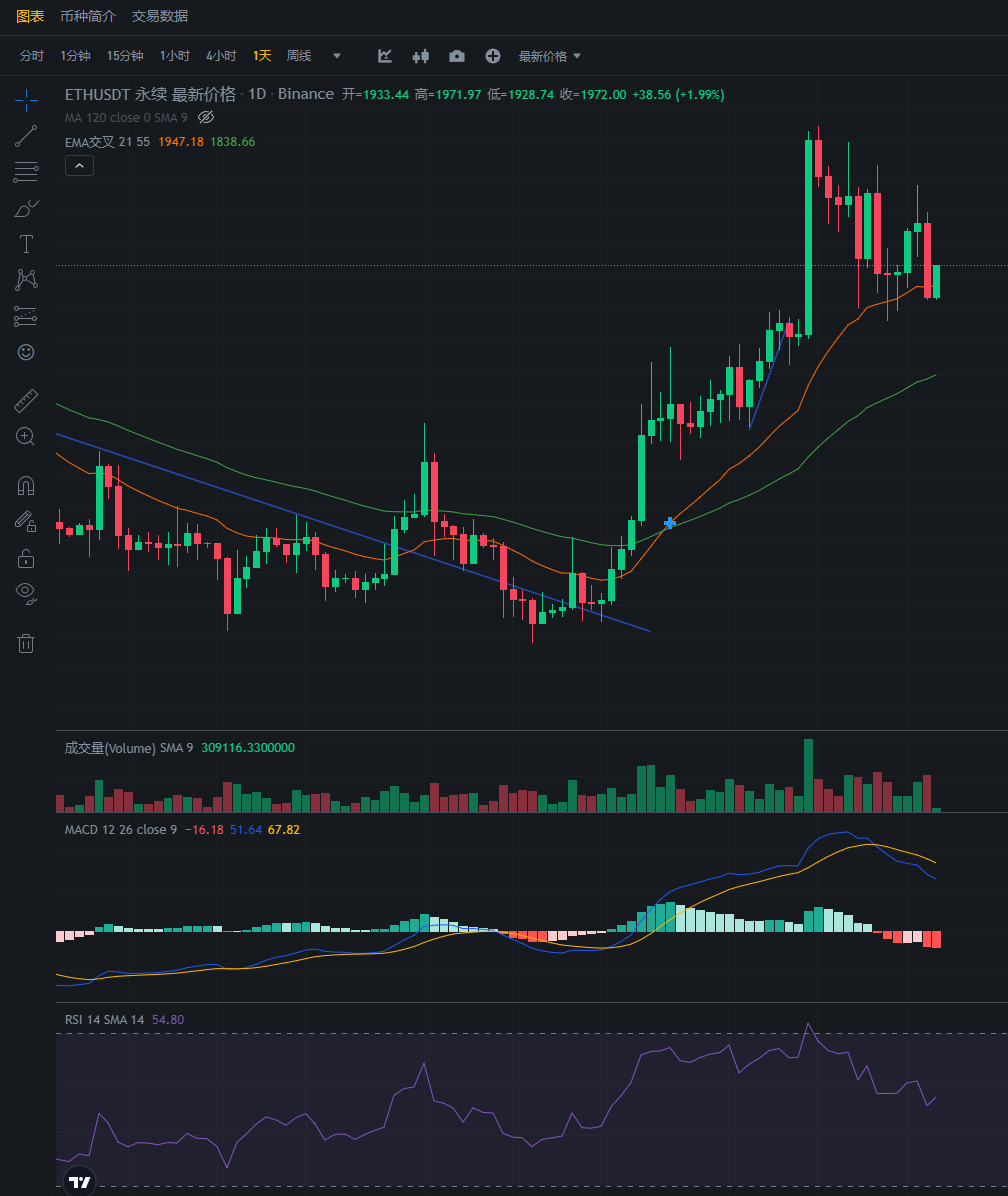 以太也跟着下跌,目前来看还是可以耐心等待。昨日的多单可以平仓止损,目前1970,也是还可以的。