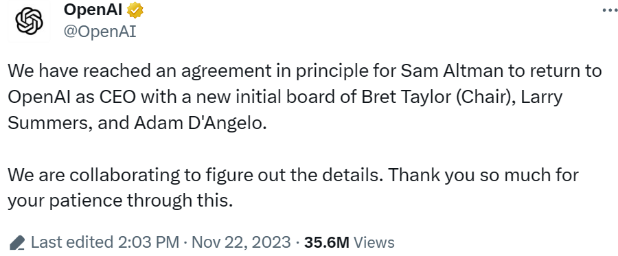 11月22日,OpenAI在社交媒体上宣布,已经原则上达成协议,奥特曼重返公司担任CEO,“并组建由布雷特·泰勒(主席)、拉里·萨默斯和亚当·德安杰洛组成的新董事会。