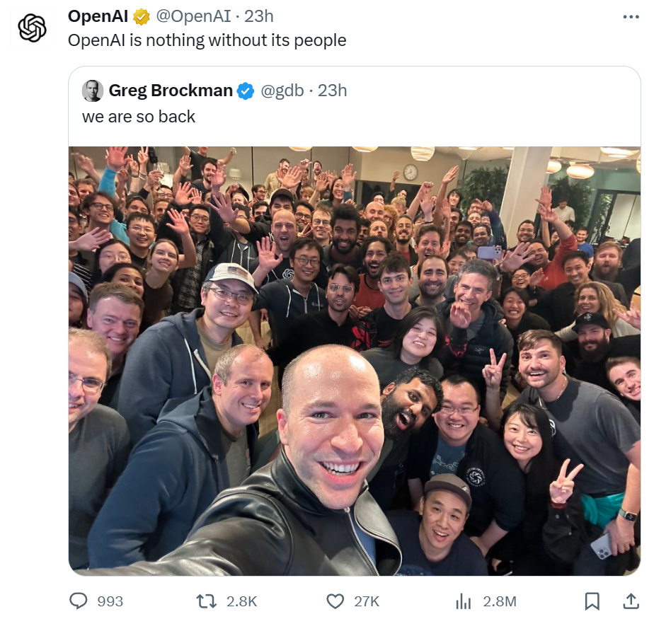 奥特曼在X上转发了大量OpenAI员工“没有员工的OpenAI啥也不是”的帖子。随后,奥特曼又连发两条帖子安抚OpenAI员工,表示为公司管理团队感到骄傲,以及“我很兴奋,我们都将以某种方式在一起工作”。