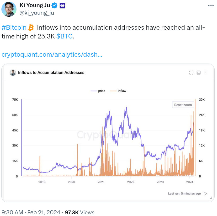与此同时,各类投资者的大量囤币,也抵消了抛售的影响,CryptoQuant首席执行官Ki Young Ju就发布数据显示,比特币囤币地址在21日流入2.53万枚BTC,创下历史新高。