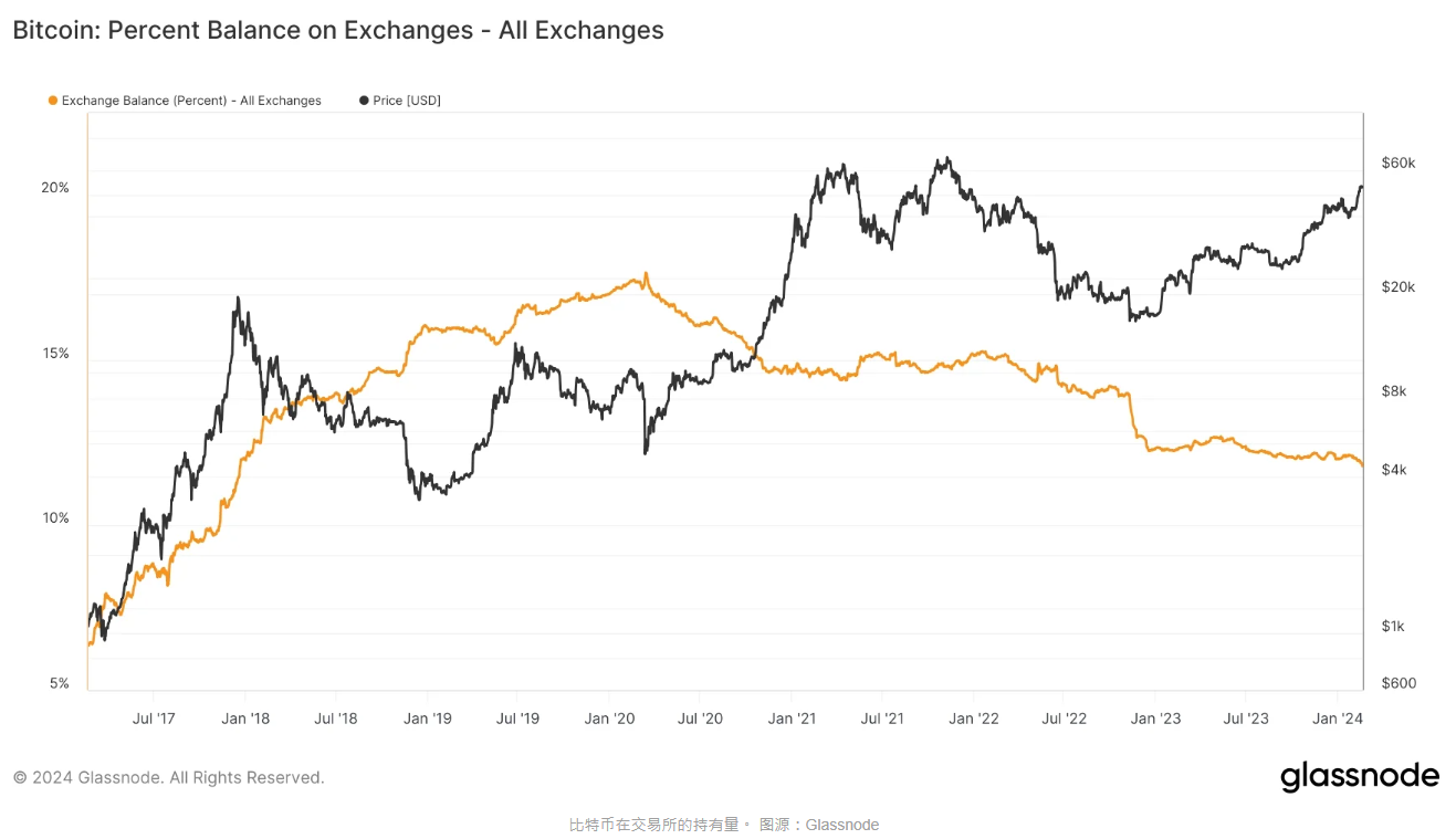 据Glassnode数据显示,今年初以来,比特币在交易所的持有量持续减少,从1月1日到2月19日,交易所钱包中的比特币余额已从235.6万枚BTC下降至231.4万枚BTC,创下自2018年4月以来的最低水平,这使得交易所在比特币供应量中的占比,已从今年初的12.03%下降至11.79%。