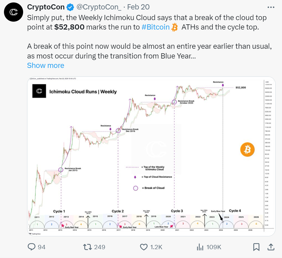 加密货币技术分析师CryptoCon指出,52800美元区域是一个关键阻力区域,是上一个市场周期顶部的标志,它在2016年和2019年对BTC价格构成了主要阻力,而2017年初和2020年底的突破为新的上涨扫清了障碍,直到创下历史新高。