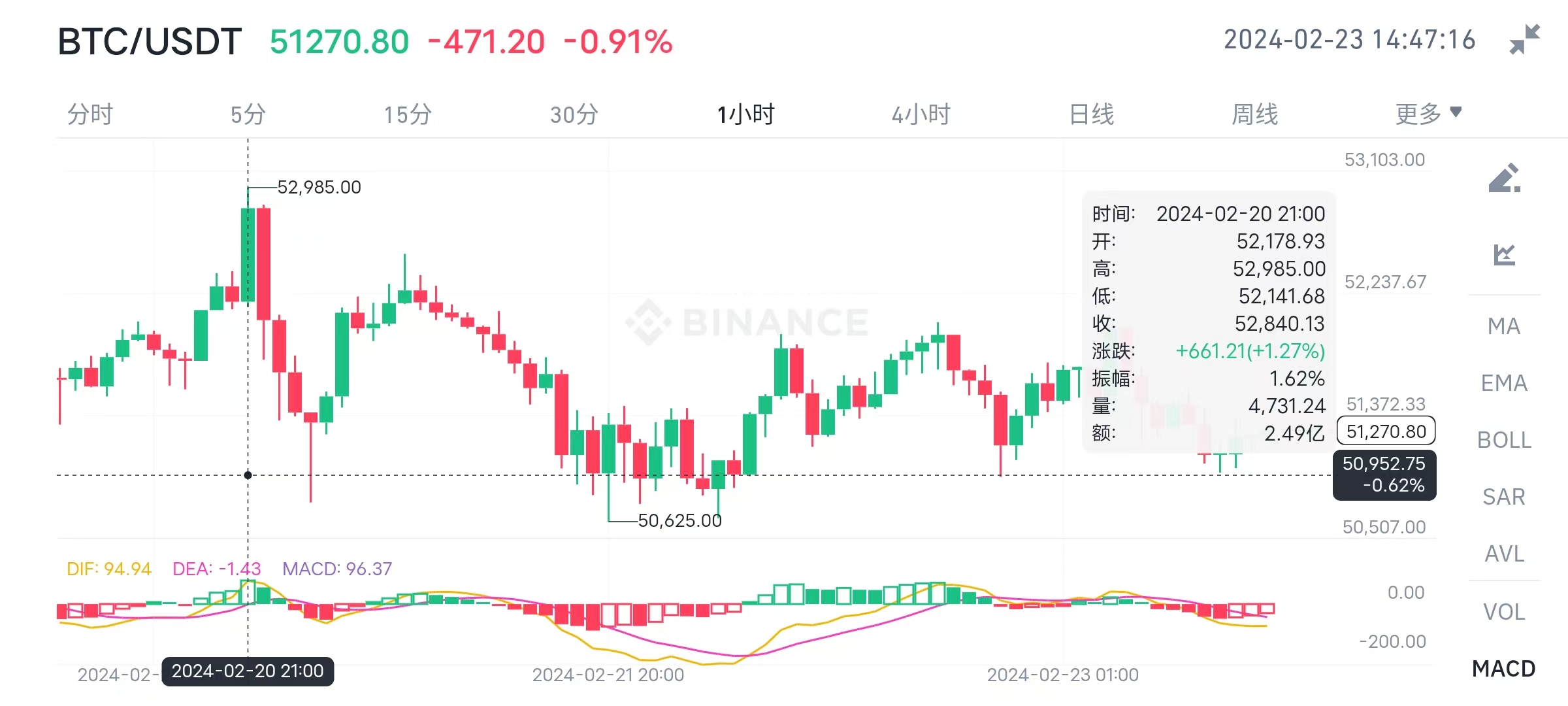 虽然比特币在20日一度冲高至近5.3万美元大关,创下自2021年11月来新高,但随后开始回落,在51000美元至52000美元之间反复窄幅波动,甚至在21日晚一度跌至50625美元。比特币的未来走势,已牵动不少投资者的心。