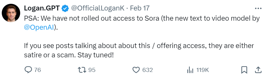 针对这些不实宣传和骗局,OpenAI的开发者关系负责人Logan发布了紧急声明,澄清Sora目前仍处于内测阶段,并未对外开放。声明同时强调,即使开放,Sora作为产品可用的时间也还没有确定。