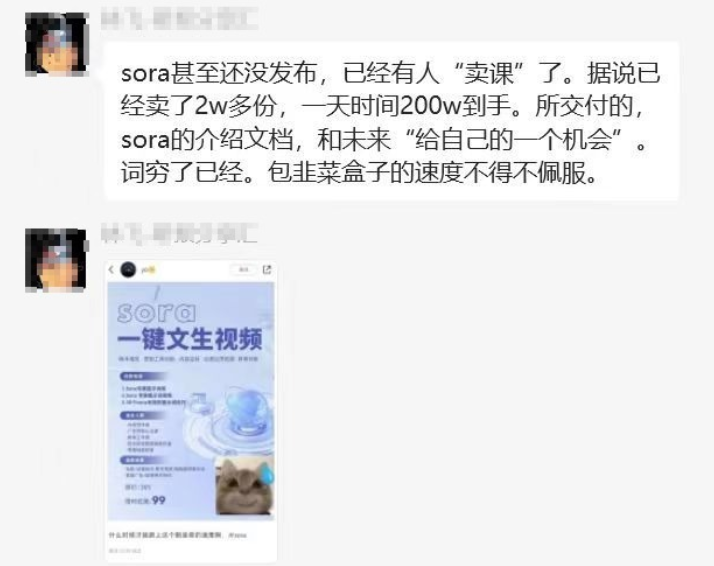 据知情人士透露,目前市面上一份Sora的课程售价为99元,一天时间就卖出了2万多份。也就是说,卖课者一天至少到手200万元。而课程交付的内容却极其简陋,只有Sora的介绍文档,以及一句空洞的口号:“给自己一个机会”,可这种欺诈手段已让不少人上当受骗。
