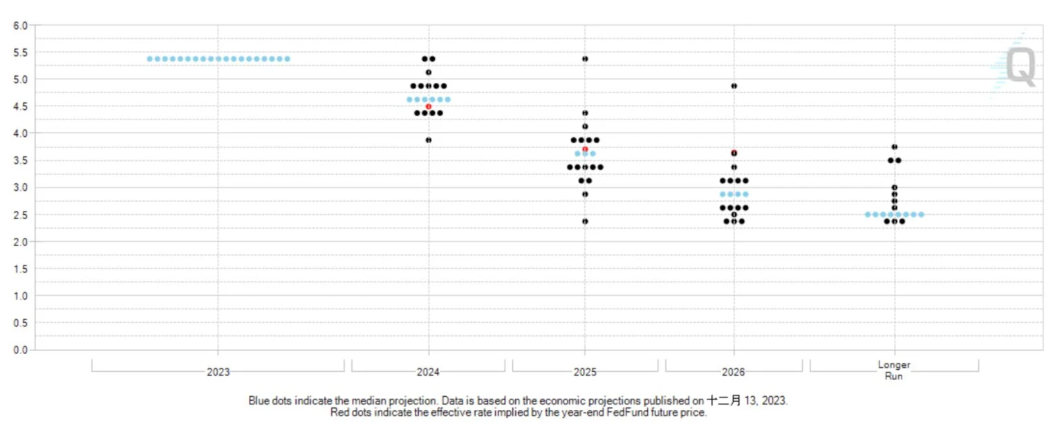 然而,更引人注目的是美联储对未来的降息计划。即使降低通胀的进展已经停滞,美联储仍坚持其之前的预测,即到2024年底将进行三次降息。利率点阵图显示,2024年至2026年联邦基金利率预期中值分别为4.6%、3.9%、3.1%。