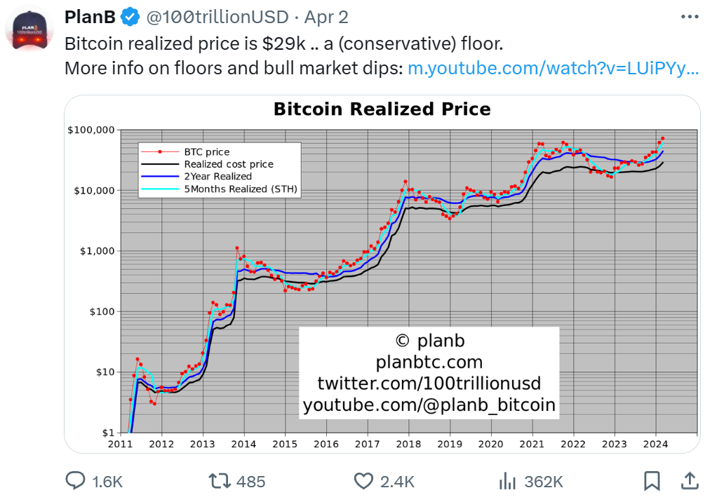 不过库存流量(S2F)模型发明者PlanB认为,比特币不会再次跌破60000美元,因为这是五个月以来的强劲支撑位。